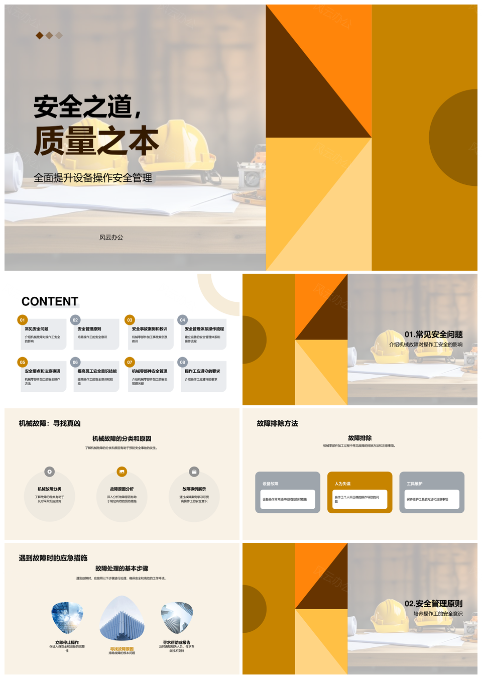 风云办公提供的机械设备安全操作培训防护管理PPT模板,下载格式为pptx,一共35页,作品中文字及图均可以修改和编辑,图片更改请在作品中右键图片并更换,文字修改请直接点击文字进行修改。