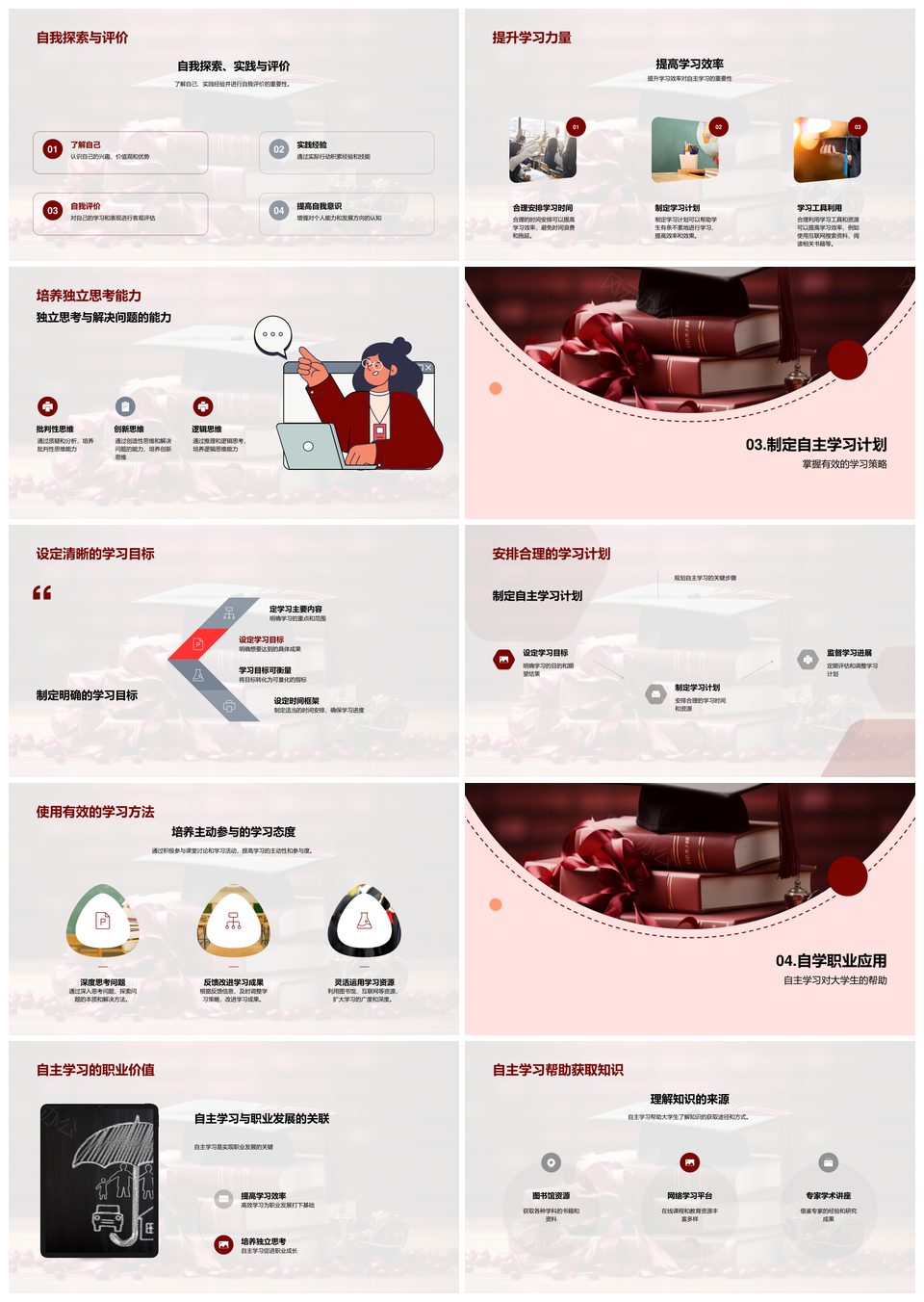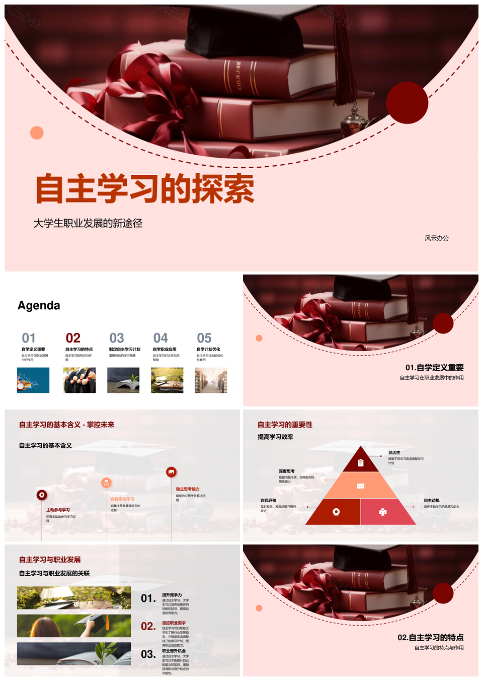 风云办公提供的大学生自主学习驱动职业发展探索实践PPT模板,下载格式为pptx,一共22页,作品中文字及图均可以修改和编辑,图片更改请在作品中右键图片并更换,文字修改请直接点击文字进行修改。