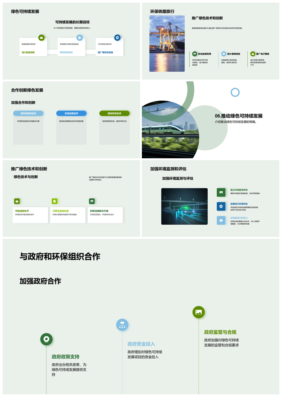 这是一张绿色铁路可持续发展环保创新合作运输PPT模板,包含绿色、铁路、可持续发展、环保、创新、合作、运输等主题内容,也可用作绿色铁路可持续发展环保、绿色铁路环保创新合作、铁路可持续发展环保创新、可持续发展环保创新合作、环保创新合作运输、绿色铁路可持续发展运输、绿色铁路环保创新运输、铁路环保创新合作运输、绿色铁路环保合作运输、铁路可持续发展环保运输、可持续发展环保创新运输、绿色环保创新合作运输、铁路环保运输、绿色铁路合作运输、环保创新运输等PPT场景使用。