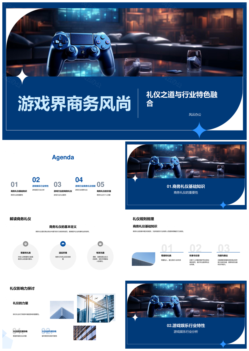 风云办公提供的游戏商务礼仪培训企业风尚PPT模板,下载格式为pptx,一共23页,作品中文字及图均可以修改和编辑,图片更改请在作品中右键图片并更换,文字修改请直接点击文字进行修改。