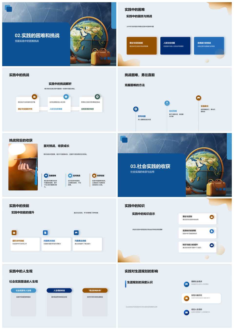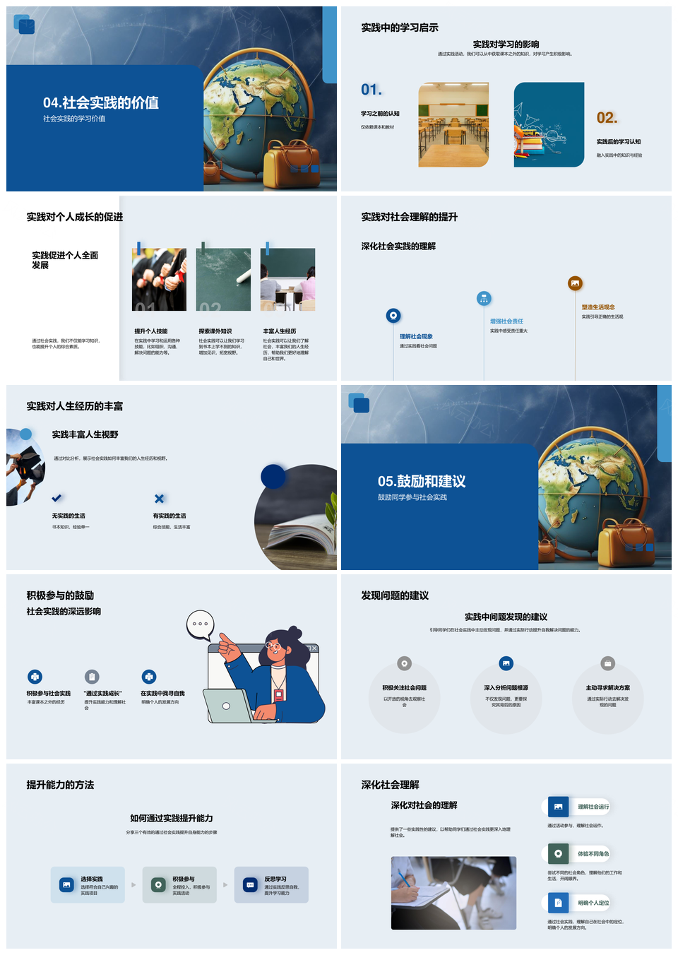 这是一张中学生社会实践技能知识收获与生涯规划PPT模板,包含中学生、社会实践、技能、知识、收获、生涯规划等主题内容,也可用作中学生社会实践技能知识、社会实践技能知识收获、技能知识收获生涯规划、中学生社会实践技能、社会实践技能知识、技能知识收获、知识收获生涯规划、社会实践技能知识收获、中学生社会实践知识、社会实践知识收获生涯规划、技能知识生涯规划、社会实践知识生涯规划、社会实践生涯规划、中学生社会实践、社会实践技能等PPT场景使用。 风云办公提供的中学生社会实践技能知识收获与生涯规划PPT模板,下载格式为pptx,一共28页,作品中文字及图均可以修改和编辑,图片更改请在作品中右键图片并更换,文字修改请直接点击文字进行修改。