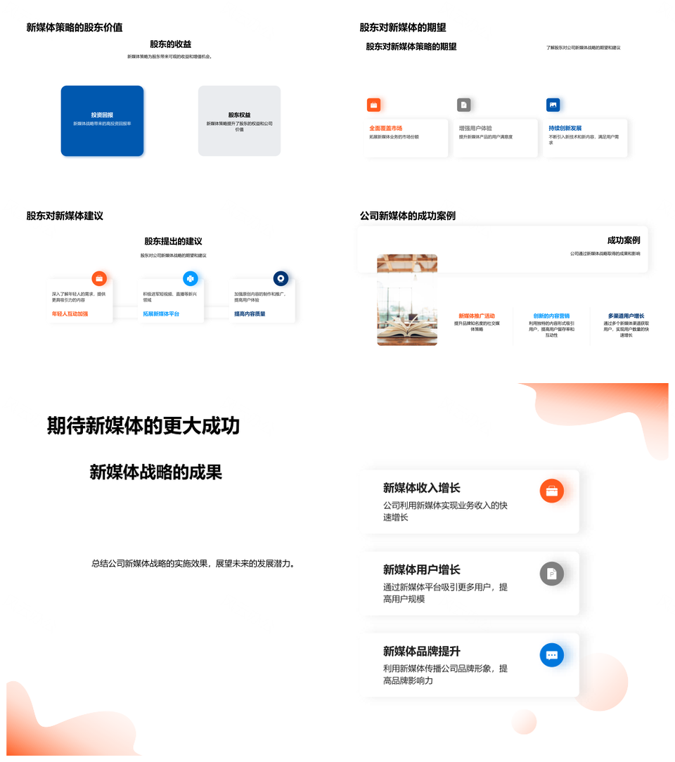 这是一张公司新媒体战略发展应对市场股东数字媒体PPT模板,包含公司、新媒体、战略、发展、应对、市场、股东、数字媒体等主题内容,也可用作公司新媒体战略发展、新媒体战略发展应对、战略发展应对市场、公司新媒体战略、新媒体战略发展、战略发展应对、发展应对市场、应对市场股东、公司新媒体、新媒体战略、战略发展、发展应对、应对市场、市场股东、股东数字媒体等PPT场景使用。 风云办公提供的公司新媒体战略发展应对市场股东数字媒体PPT模板,下载格式为pptx,一共33页,作品中文字及图均可以修改和编辑,图片更改请在作品中右键图片并更换,文字修改请直接点击文字进行修改。