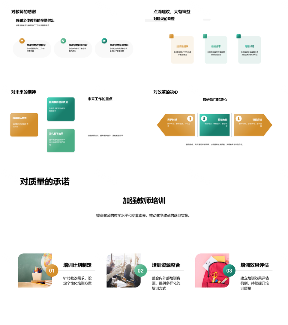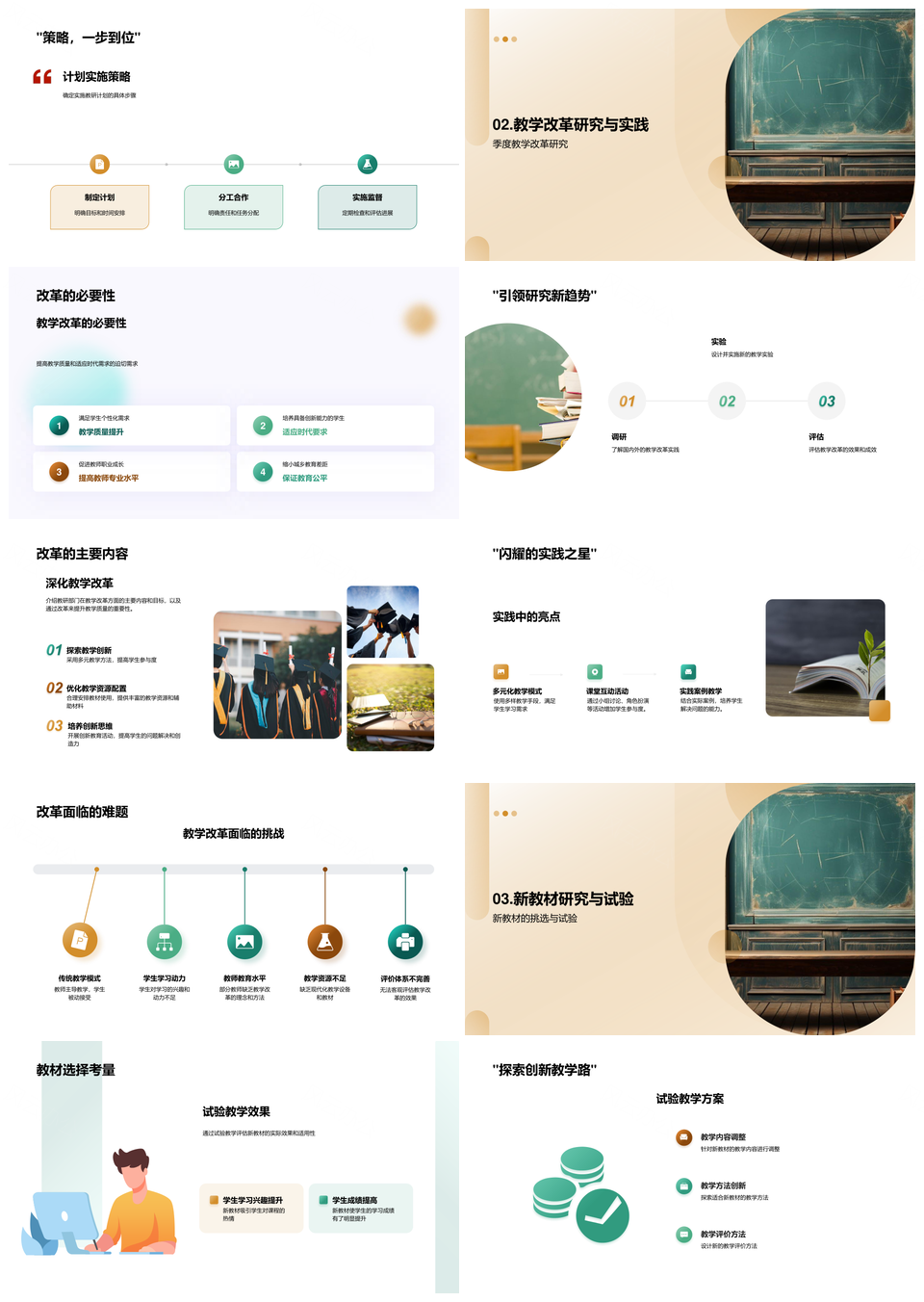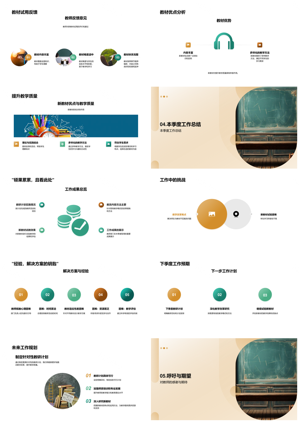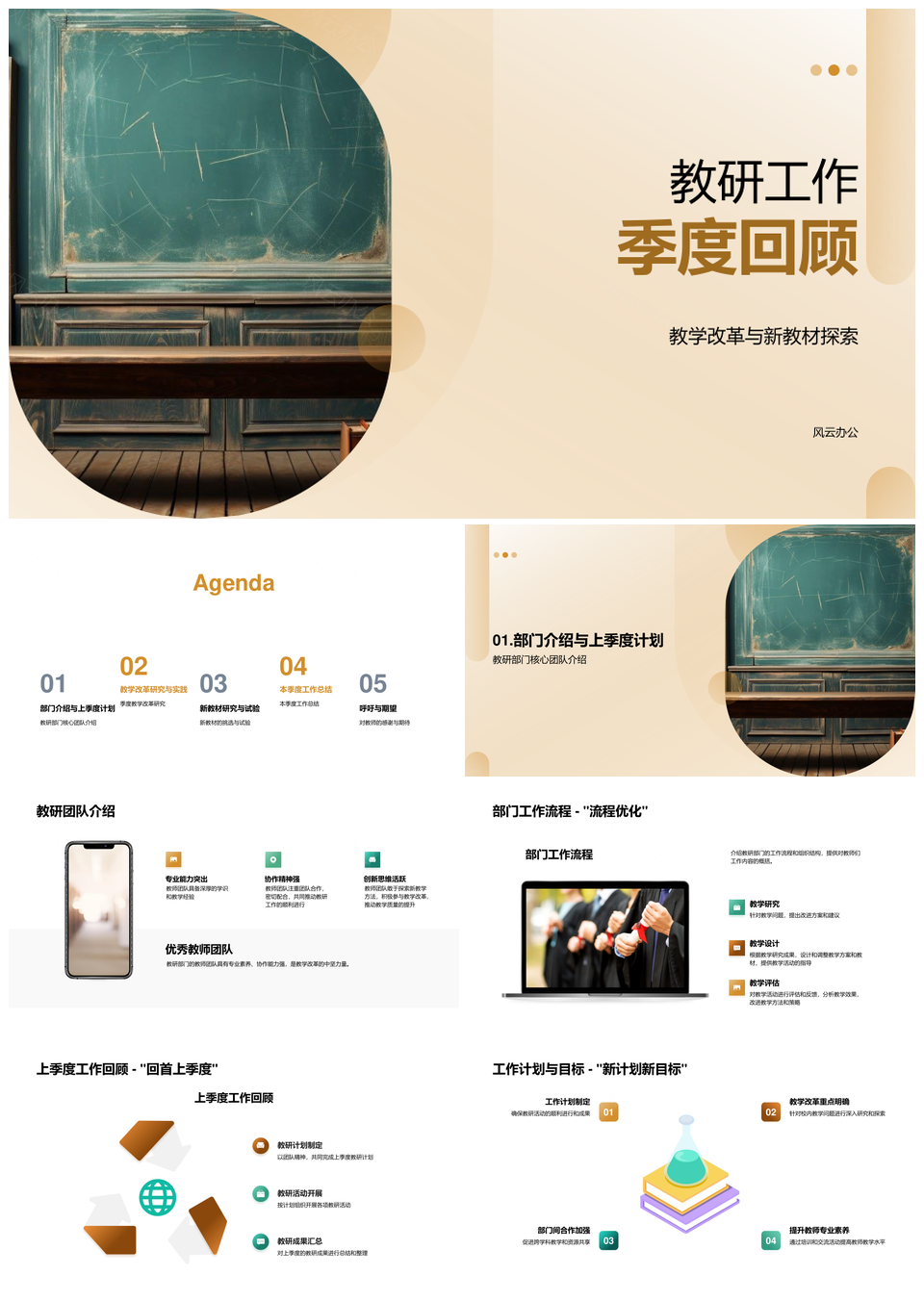 风云办公提供的教研部门季度教改新教材试验总结PPT模板,下载格式为pptx,一共33页,作品中文字及图均可以修改和编辑,图片更改请在作品中右键图片并更换,文字修改请直接点击文字进行修改。