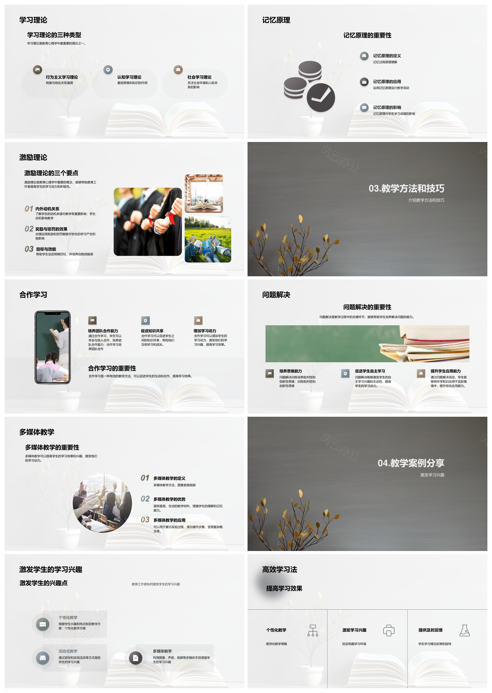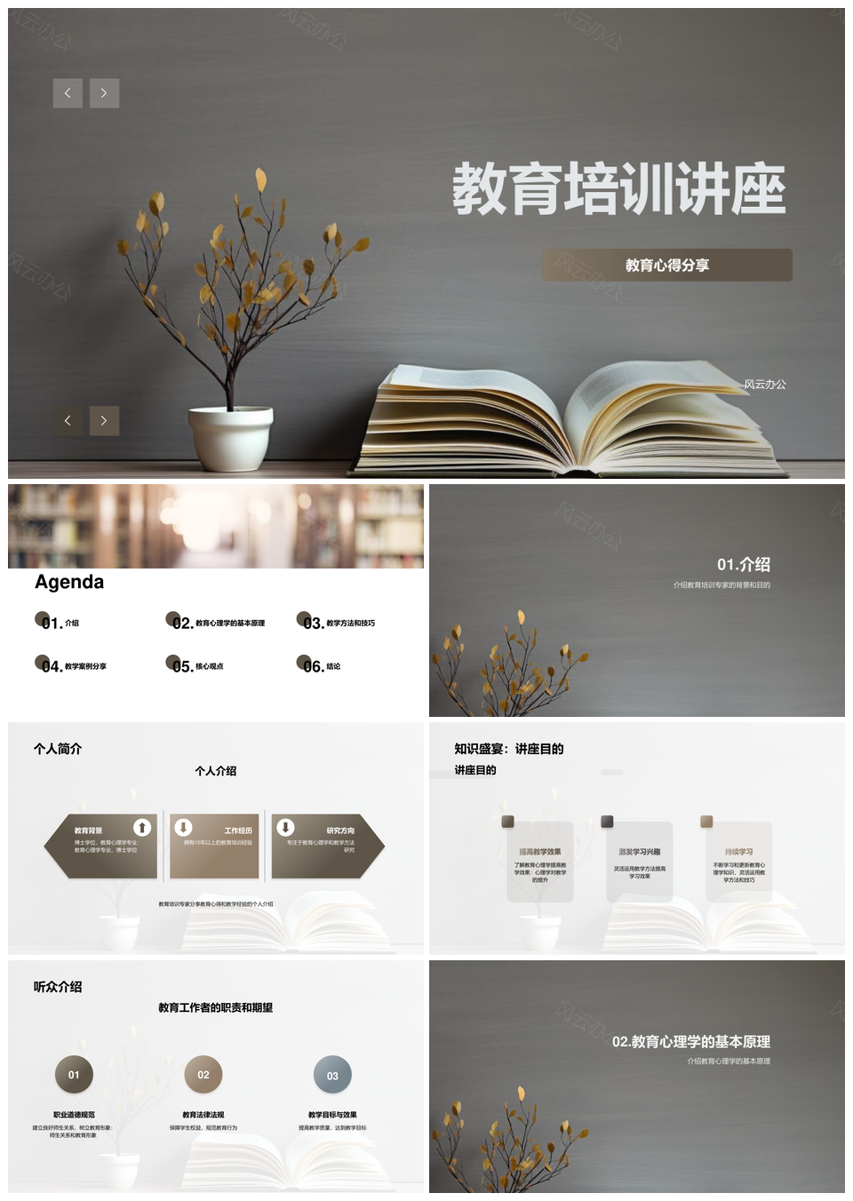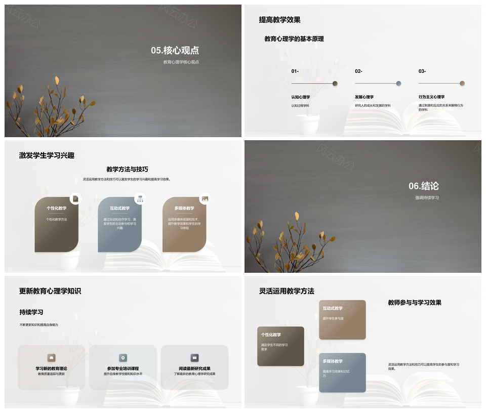 风云办公提供的教育专家教学心理学方法技巧案例书籍PPT模板,下载格式为pptx,一共24页,作品中文字及图均可以修改和编辑,图片更改请在作品中右键图片并更换,文字修改请直接点击文字进行修改。