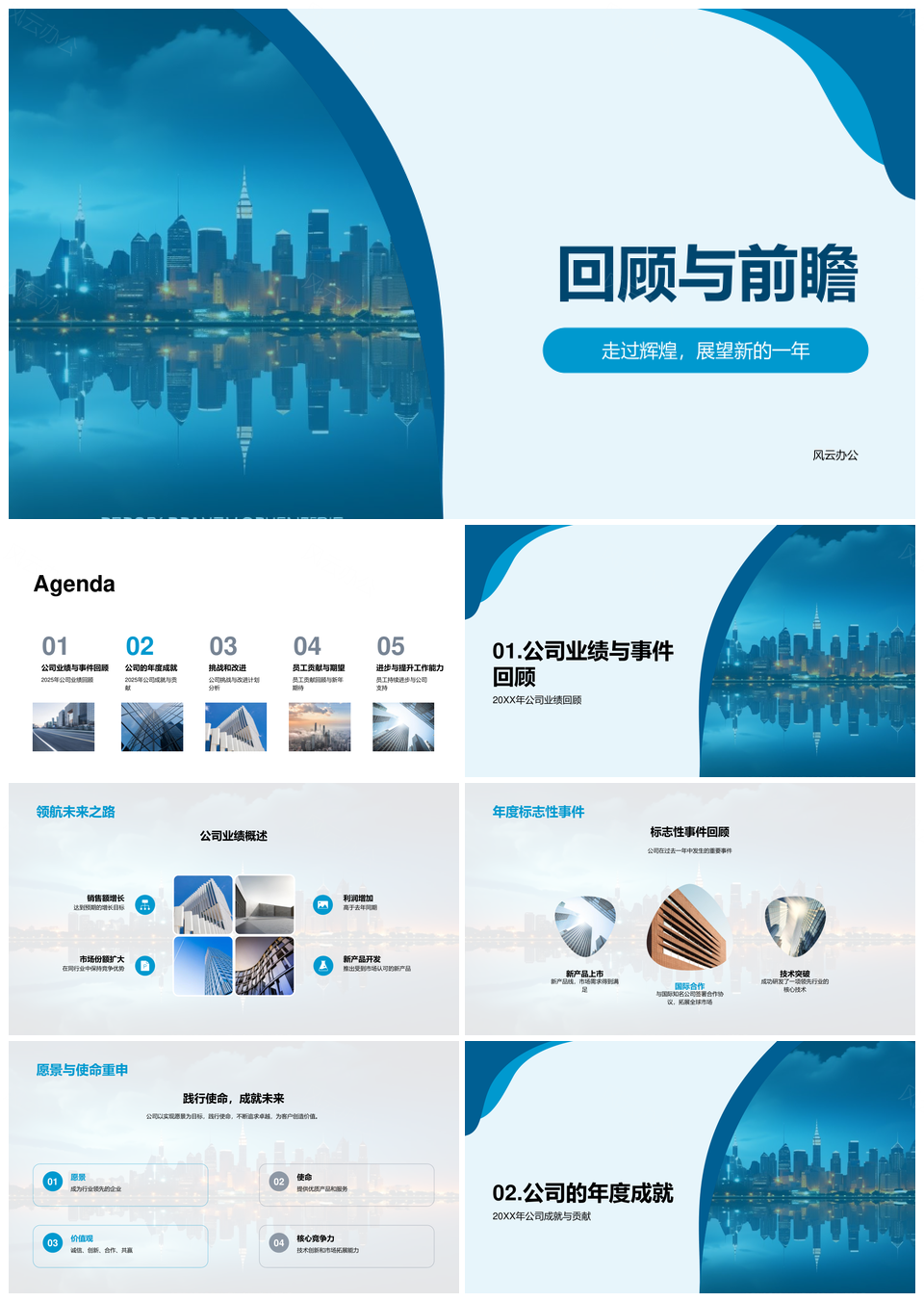 2025昂首阔步公司年度回顾展望成就挑战财务市场人才管理天际线PPT模板