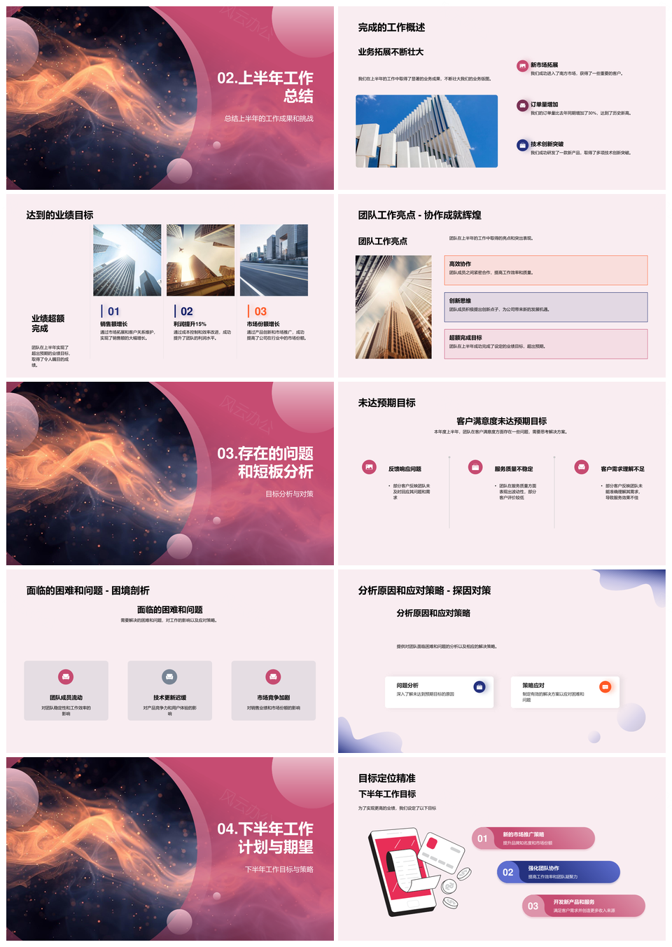 这是一张年中工作汇报业绩回顾达标未达下半年规划团队职责PPT模板,包含年中、工作汇报、业绩回顾、达标、未达、下半年、规划、团队、职责等主题内容,也可用作年中工作汇报业绩回顾、工作汇报业绩回顾达标、业绩回顾达标未达、达标未达下半年、未达下半年规划、下半年规划团队职责、年中工作汇报达标、工作汇报达标未达、业绩回顾未达下半年、达标下半年规划、年中业绩回顾规划、年中未达规划、工作汇报团队职责、年中规划团队职责、业绩回顾团队职责等PPT场景使用。 风云办公提供的年中工作汇报业绩回顾达标未达下半年规划团队职责PPT模板,下载格式为pptx,一共24页,作品中文字及图均可以修改和编辑,图片更改请在作品中右键图片并更换,文字修改请直接点击文字进行修改。