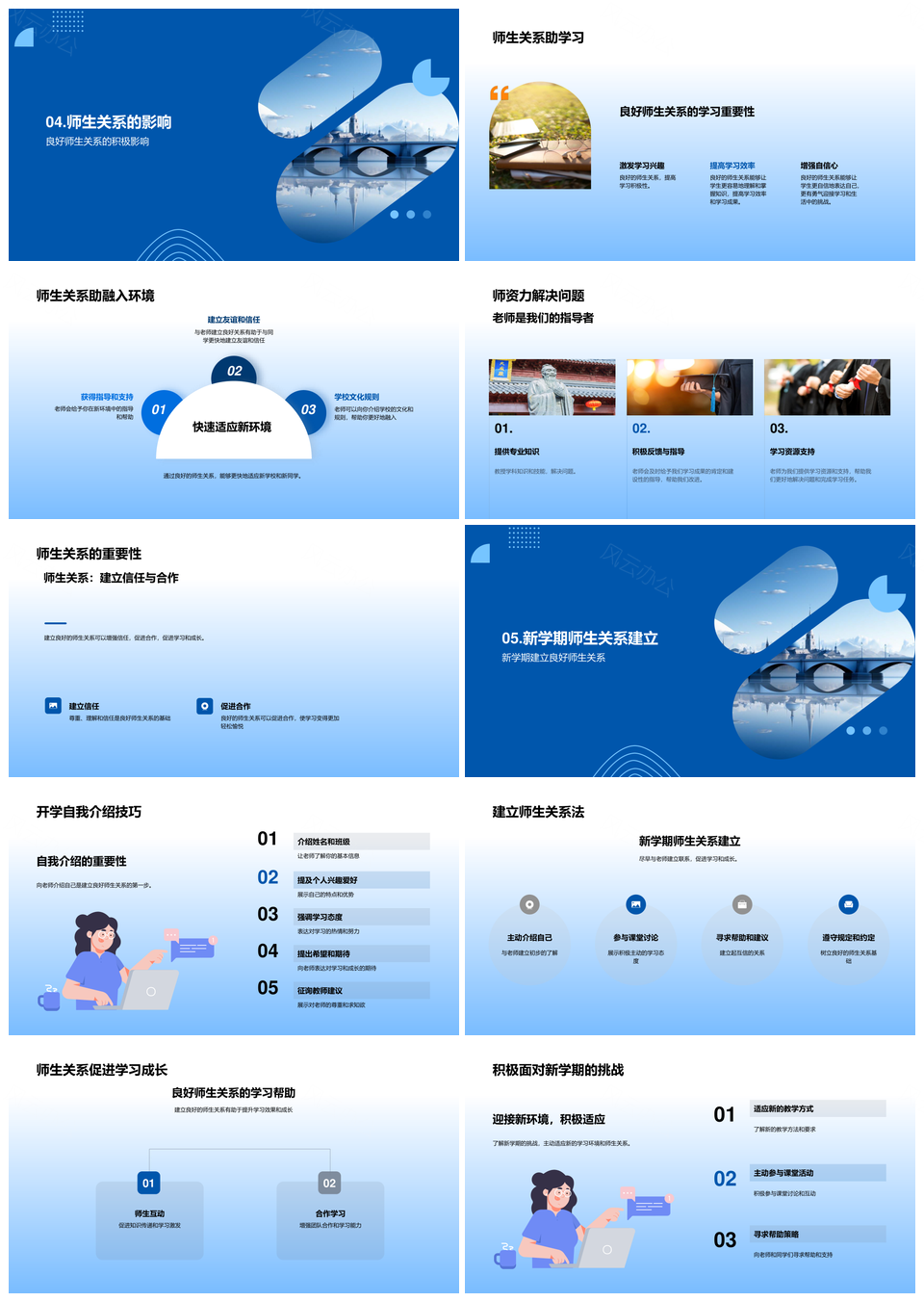 这是一张师生桥梁构建班主任任课老师促沟通助成长提问解决PPT模板,包含师生、桥梁、构建、班主任、任课老师、促沟通、助成长、提问、解决等主题内容,也可用作师生桥梁构建班主任、构建师生桥梁沟通、师生桥梁沟通成长、班主任任课老师沟通、任课老师沟通解决、构建沟通解决成长、师生沟通解决成长、师生桥梁构建成长、班主任沟通解决、任课老师提问解决、构建师生桥梁、师生桥梁沟通、班主任沟通、沟通解决成长、提问解决等PPT场景使用。 风云办公提供的师生桥梁构建班主任任课老师促沟通助成长提问解决PPT模板,下载格式为pptx,一共28页,作品中文字及图均可以修改和编辑,图片更改请在作品中右键图片并更换,文字修改请直接点击文字进行修改。