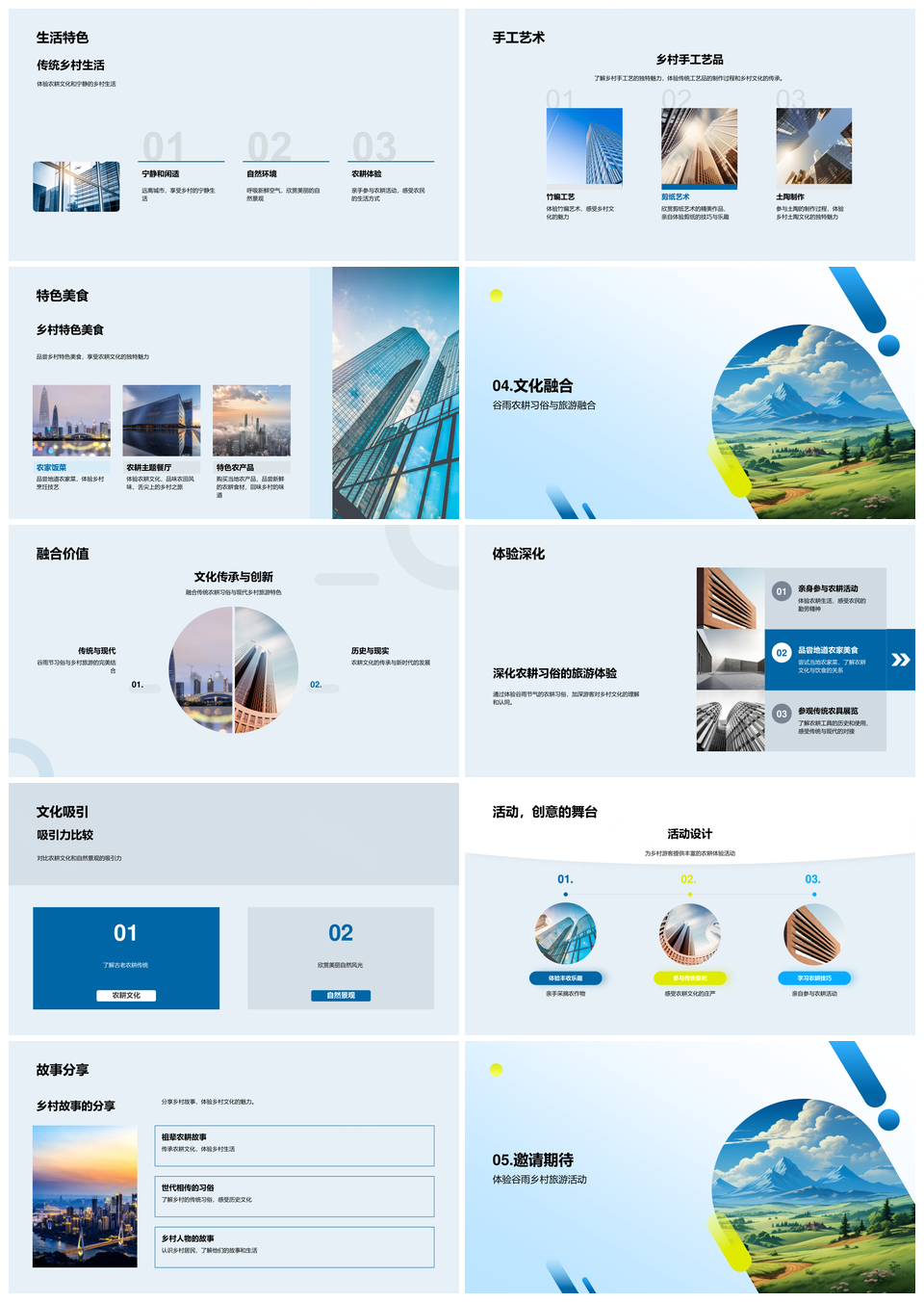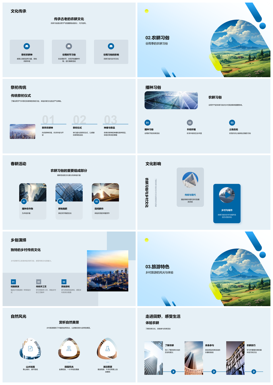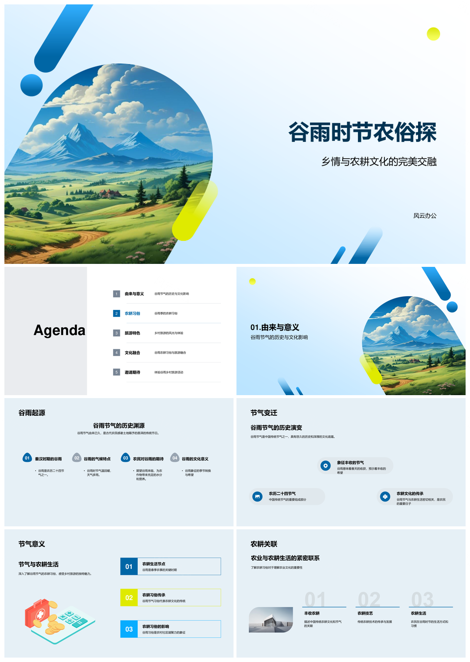 风云办公提供的谷雨农俗乡情农耕春耕游体验乡村景PPT模板,下载格式为pptx,一共33页,作品中文字及图均可以修改和编辑,图片更改请在作品中右键图片并更换,文字修改请直接点击文字进行修改。