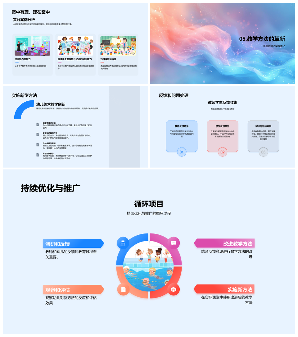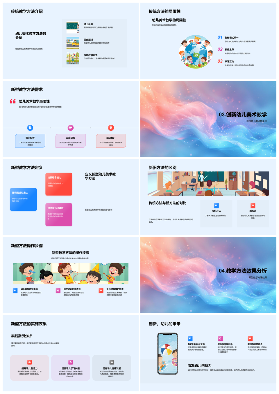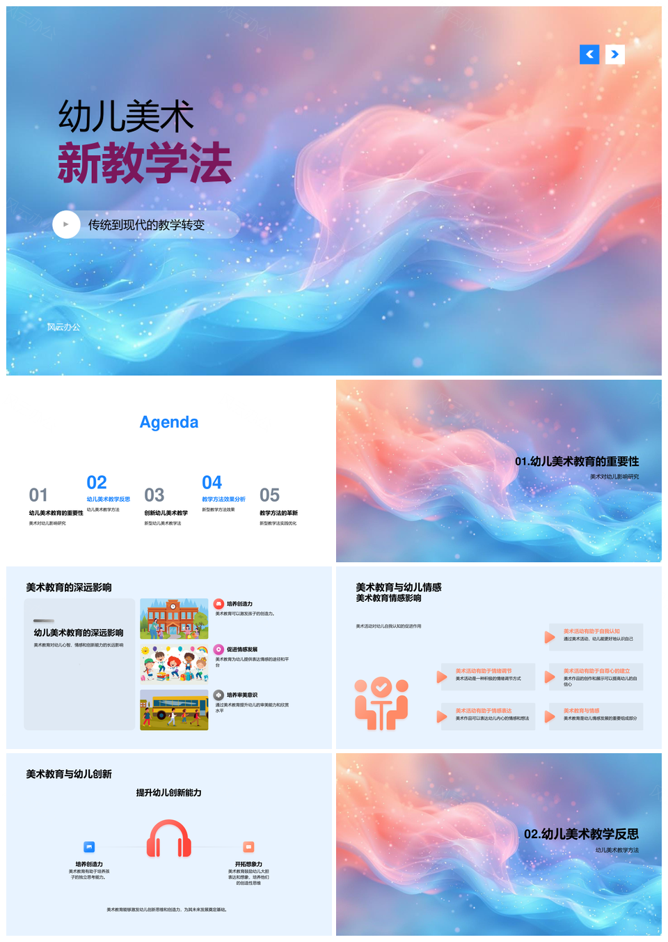 风云办公提供的幼儿美术新教学法激发创新力PPT模板,下载格式为pptx,一共23页,作品中文字及图均可以修改和编辑,图片更改请在作品中右键图片并更换,文字修改请直接点击文字进行修改。