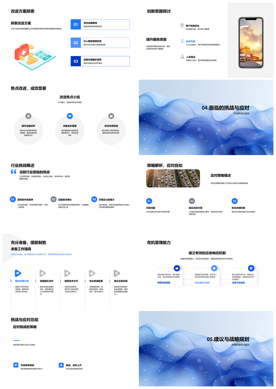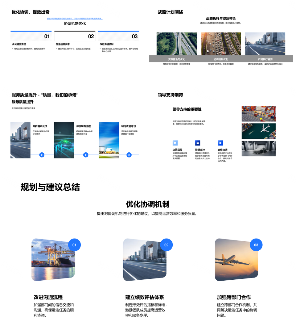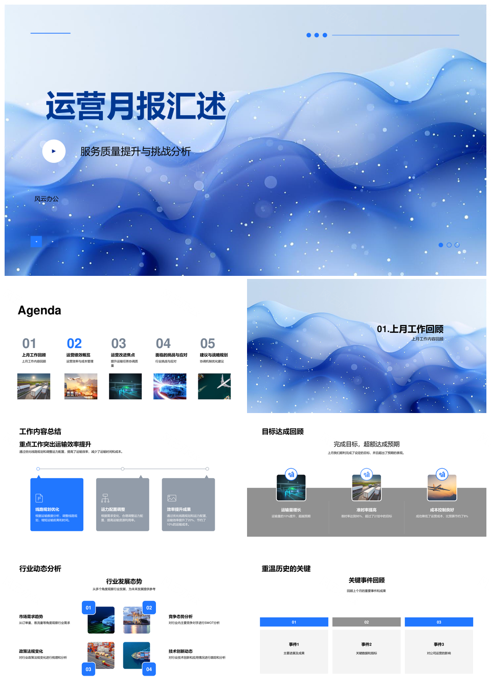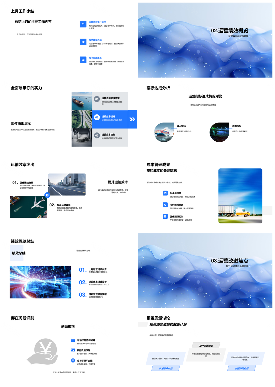 这是一张运营月报服务质效挑战成本运输改进协调分析PPT模板,包含运营、月报、服务、质效、挑战、成本、运输、改进、协调、分析等主题内容,也可用作运营月报服务质效、月报服务质效挑战、服务质效挑战成本、质效挑战成本运输、挑战成本运输改进、成本运输改进协调、运输改进协调分析、运营月报服务、月报服务质效、服务质效挑战、挑战成本运输、成本运输改进、运输改进协调、改进协调分析、协调分析运营等PPT场景使用。 风云办公提供的运营月报服务质效挑战成本运输改进协调分析PPT模板,下载格式为pptx,一共33页,作品中文字及图均可以修改和编辑,图片更改请在作品中右键图片并更换,文字修改请直接点击文字进行修改。
