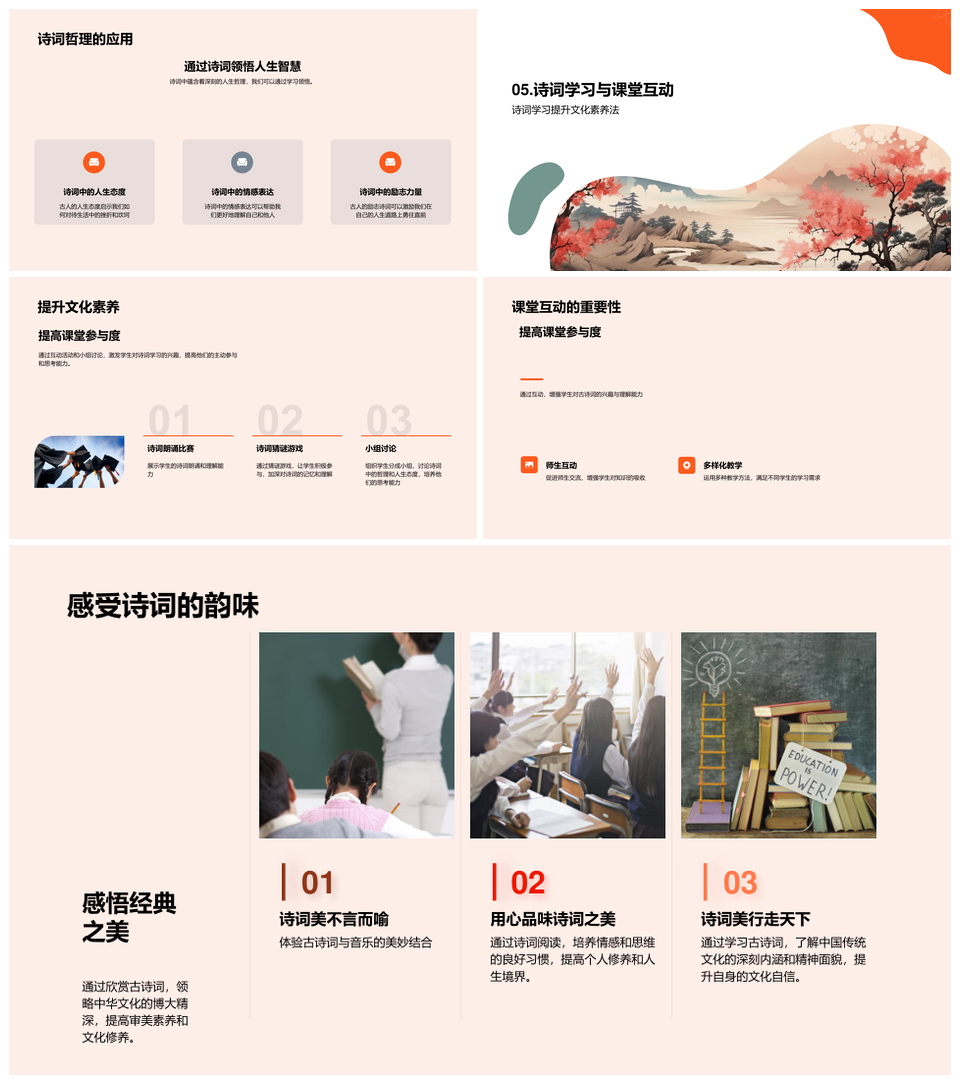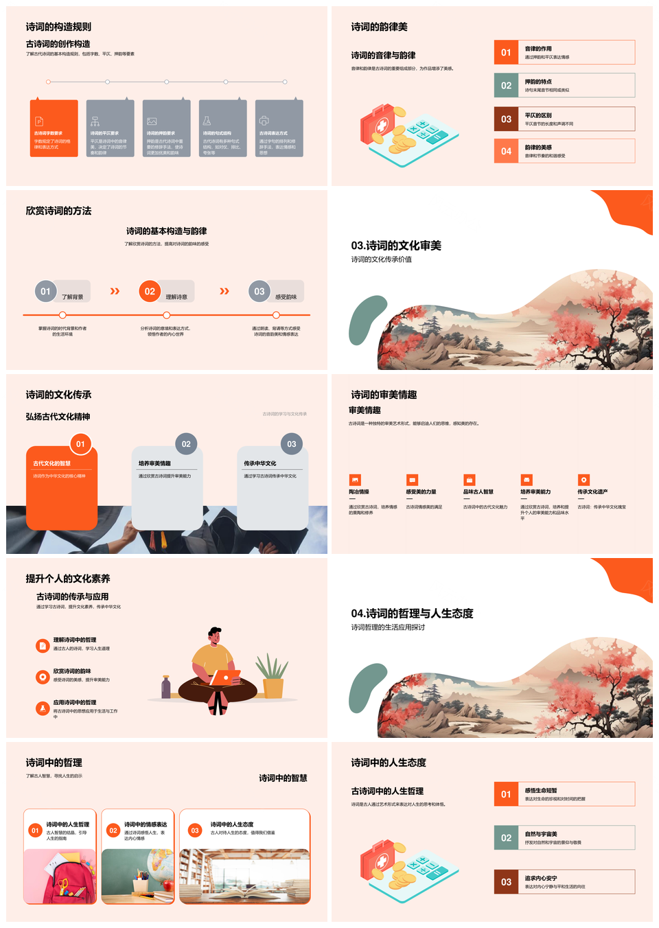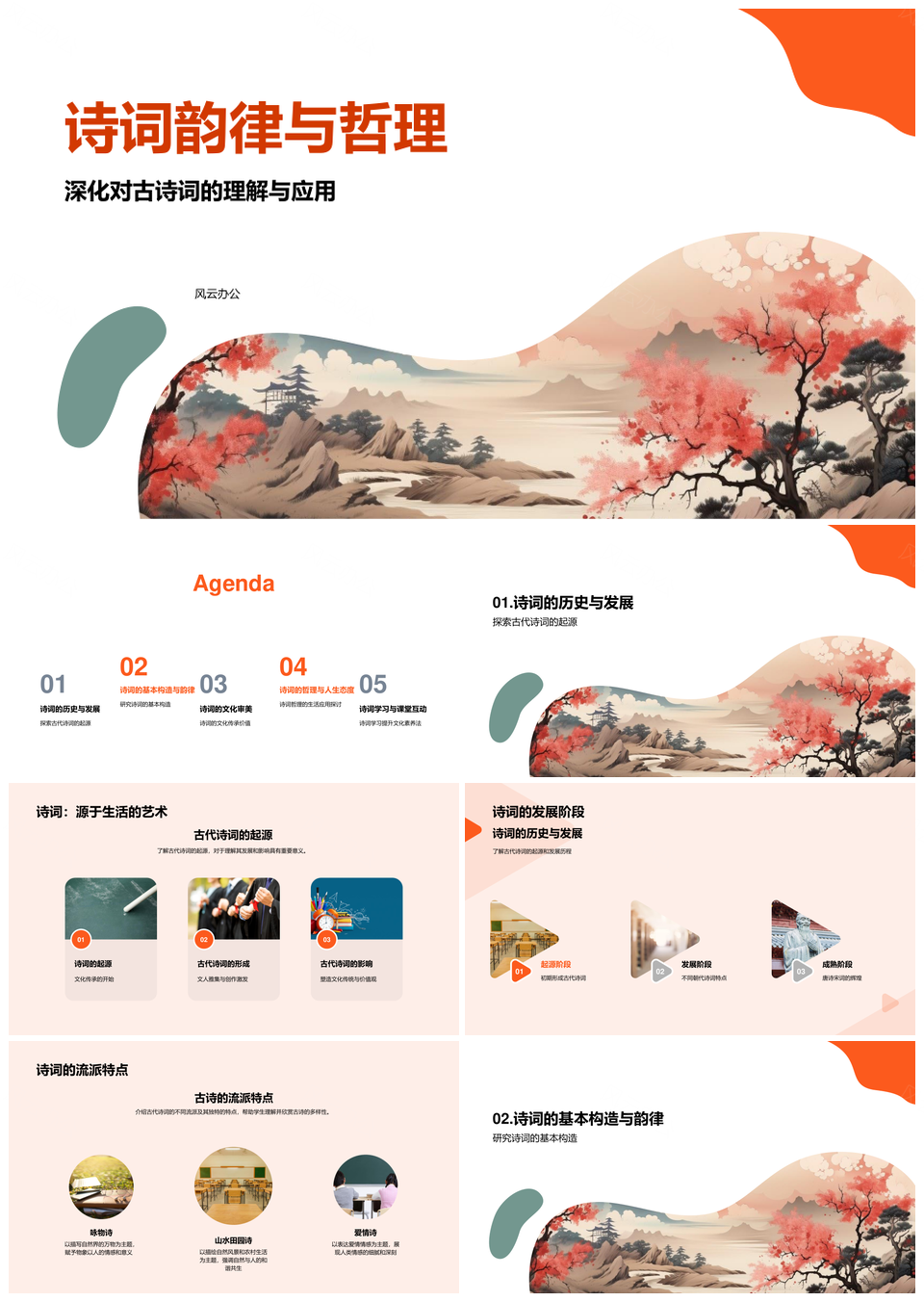 风云办公提供的诗词韵律流派文史审美哲思PPT模板,下载格式为pptx,一共23页,作品中文字及图均可以修改和编辑,图片更改请在作品中右键图片并更换,文字修改请直接点击文字进行修改。