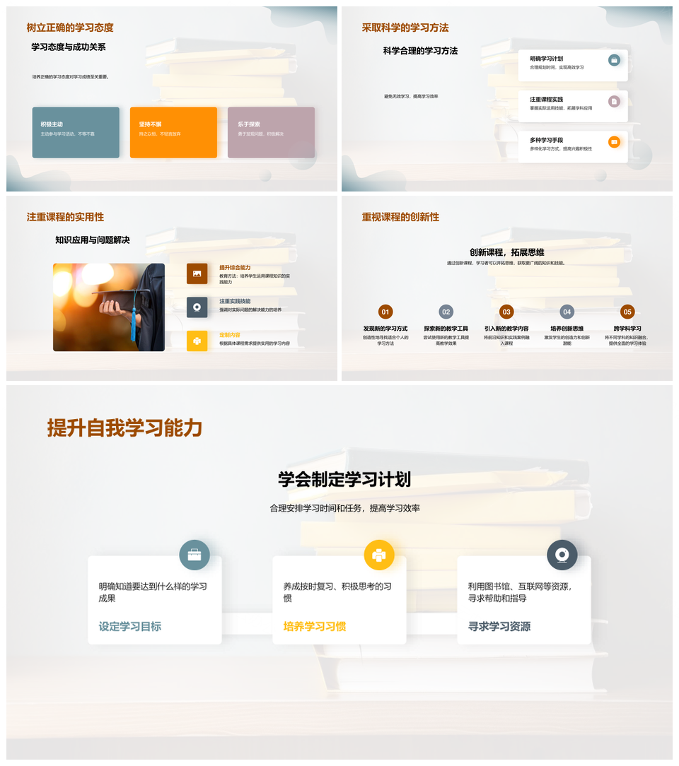 精进课程学习法优秀态度实践技能内容定制PPT模板推荐