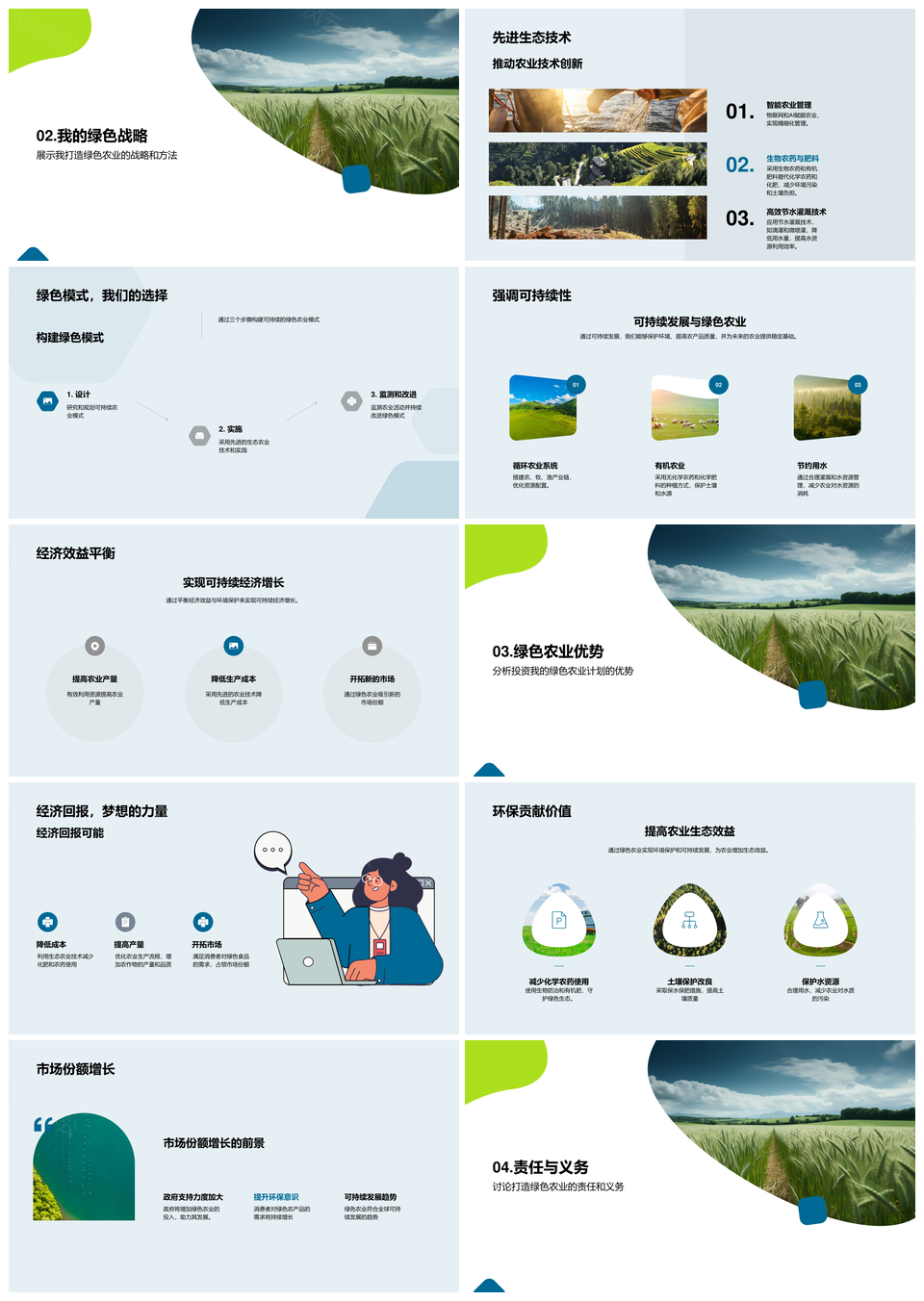 这是一张绿色农业环保可持续模式提升经济效益PPT模板,包含绿色农业、环保、可持续、模式、提升、经济效益等主题内容,也可用作绿色农业环保可持续、农业环保可持续模式、环保可持续模式提升、可持续模式提升经济、模式提升经济效益、绿色农业环保模式、绿色环保可持续模式、农业环保模式提升、绿色农业环保、农业环保可持续、环保可持续模式、可持续模式提升、模式提升经济、提升经济效益、绿色环保可持续等PPT场景使用。