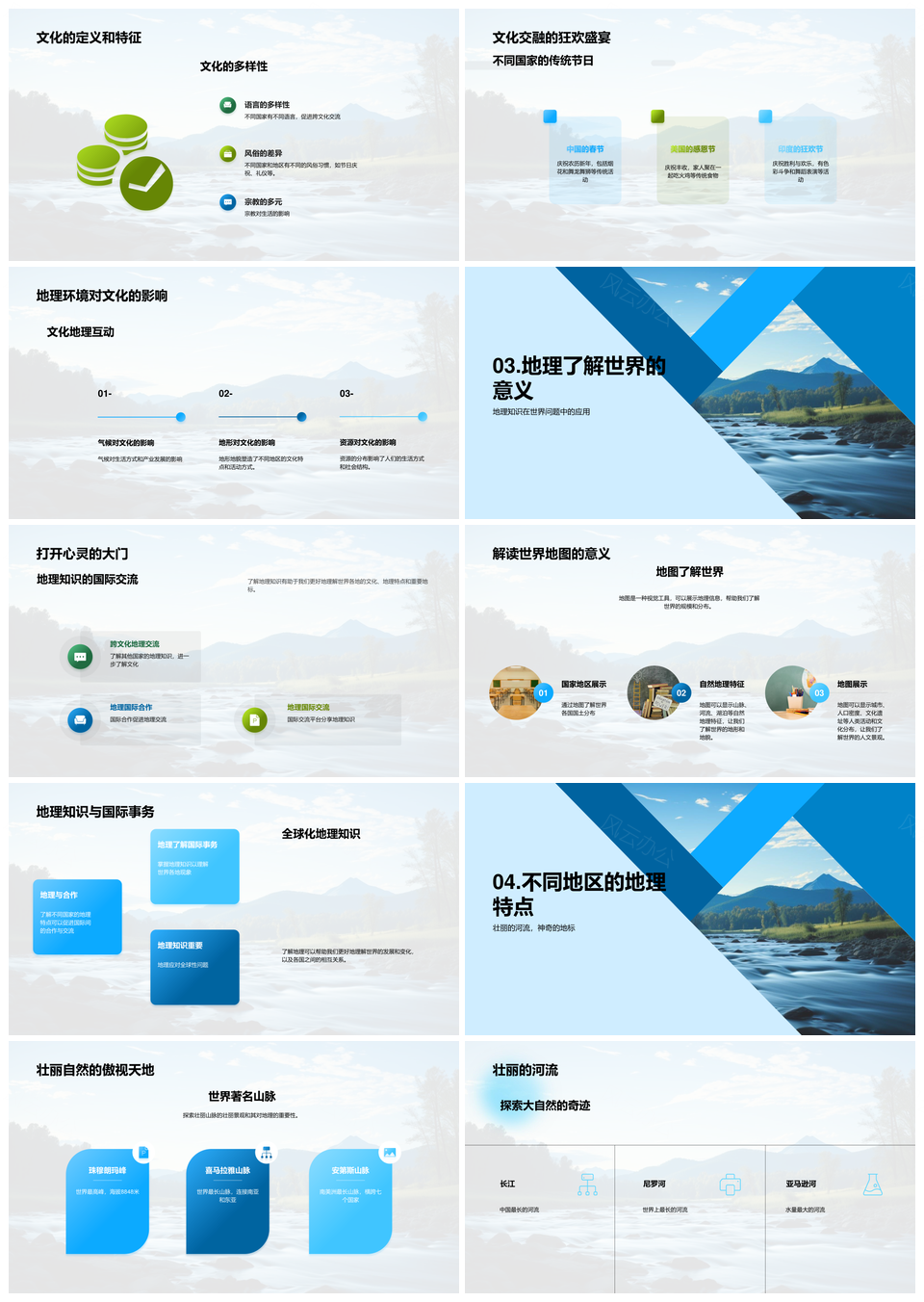 风云办公提供的五年级地理知识探世界山脉河流文化PPT模板,下载格式为pptx,一共27页,作品中文字及图均可以修改和编辑,图片更改请在作品中右键图片并更换,文字修改请直接点击文字进行修改。