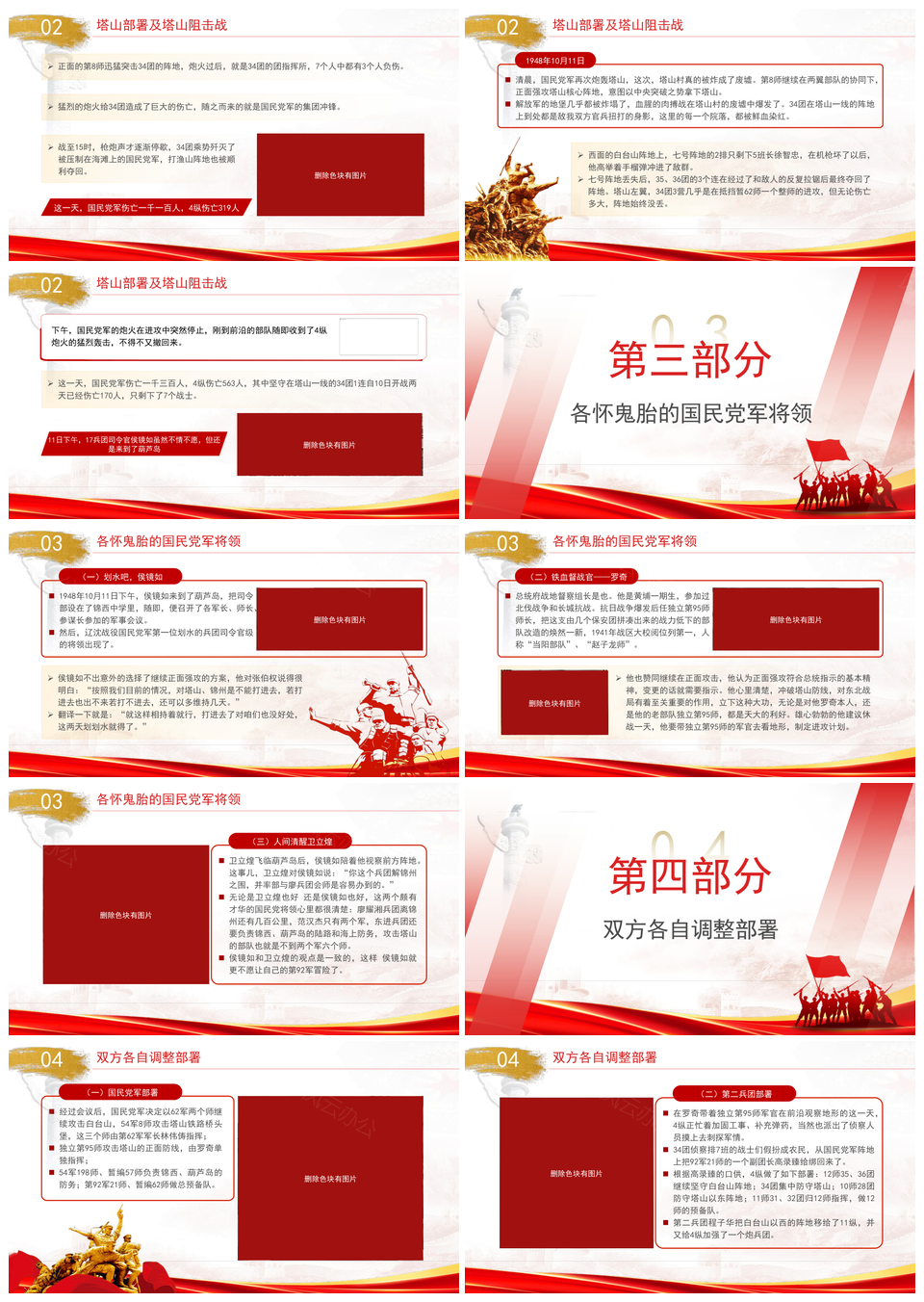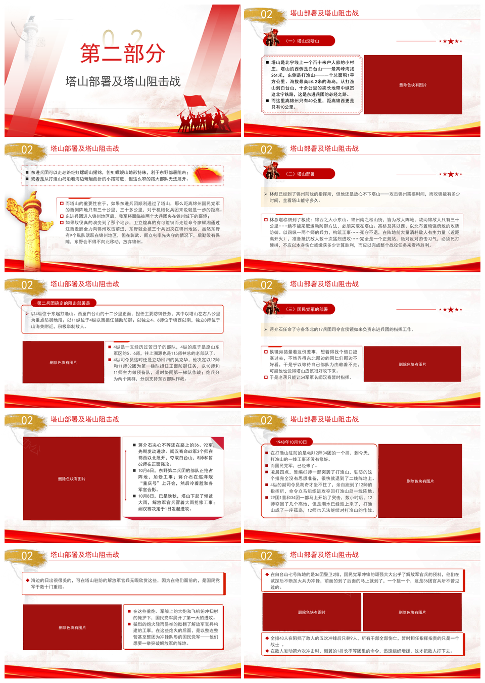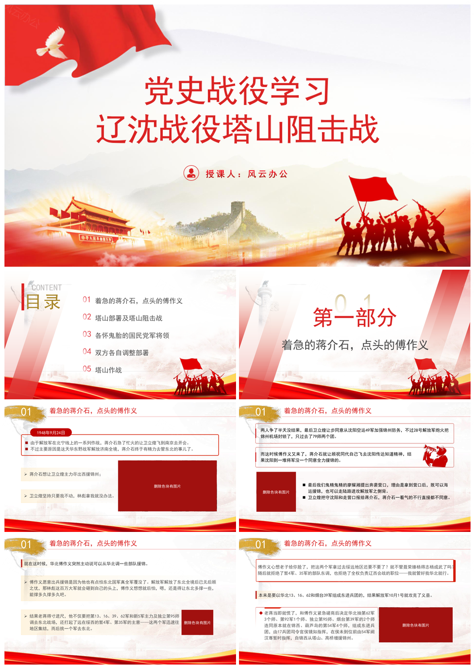风云办公提供的党史辽沈战役塔山阻击战党课PPT课件,下载格式为pptx,一共34页,作品中文字及图均可以修改和编辑,图片更改请在作品中右键图片并更换,文字修改请直接点击文字进行修改。
