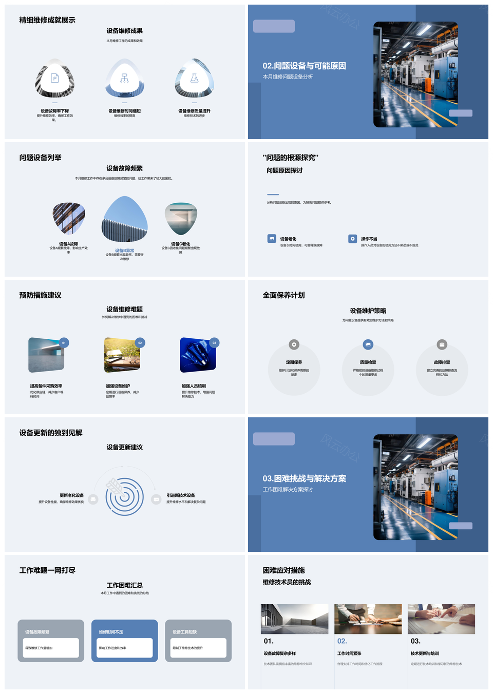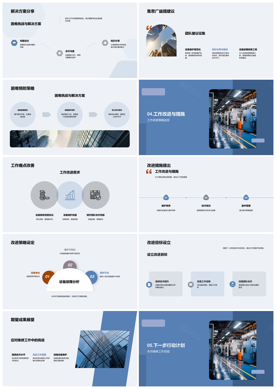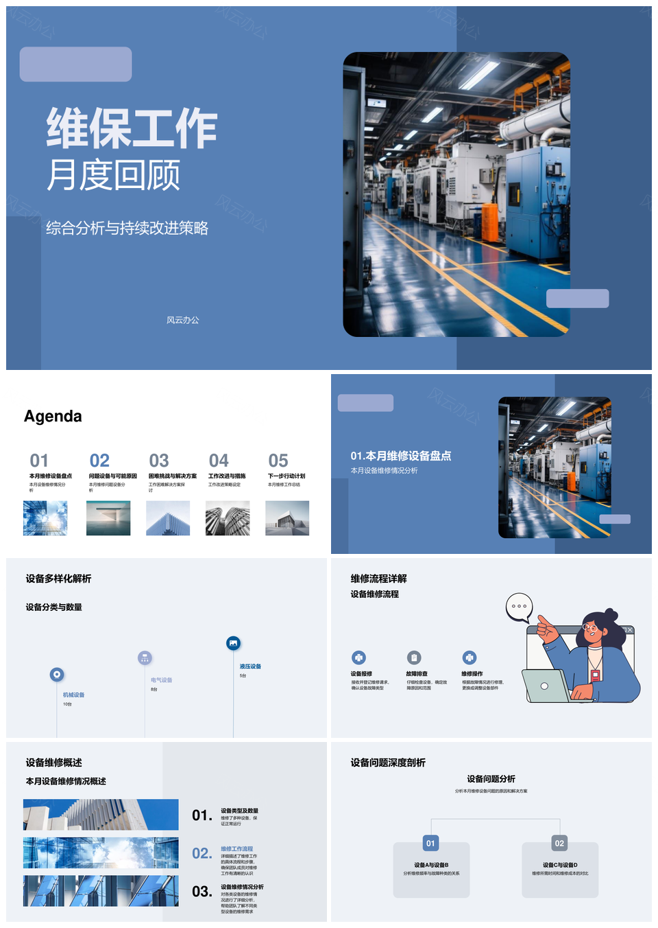 风云办公提供的工业机械维保月报故障分析及效率提升PPT模板,下载格式为pptx,一共33页,作品中文字及图均可以修改和编辑,图片更改请在作品中右键图片并更换,文字修改请直接点击文字进行修改。