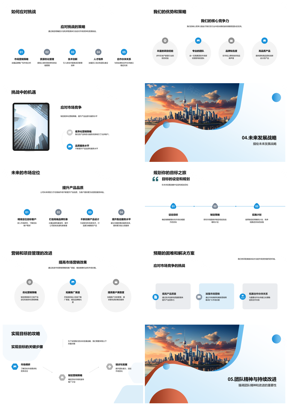 这是一张公司战略规划应对市场土地挑战促项目增长PPT模板,包含公司、战略规划、应对、市场、土地、挑战、项目、增长等主题内容,也可用作公司战略规划应对市场土地挑战、公司战略规划应对、战略规划应对市场土地挑战、战略规划应对市场土地、应对市场土地挑战项目、应对市场土地挑战、市场土地挑战项目增长、市场土地挑战项目、公司战略应对挑战、战略规划应对市场、战略应对市场挑战、规划应对市场土地、市场土地项目增长、挑战项目增长、战略规划应对等PPT场景使用。 风云办公提供的公司战略规划应对市场土地挑战促项目增长PPT模板,下载格式为pptx,一共33页,作品中文字及图均可以修改和编辑,图片更改请在作品中右键图片并更换,文字修改请直接点击文字进行修改。