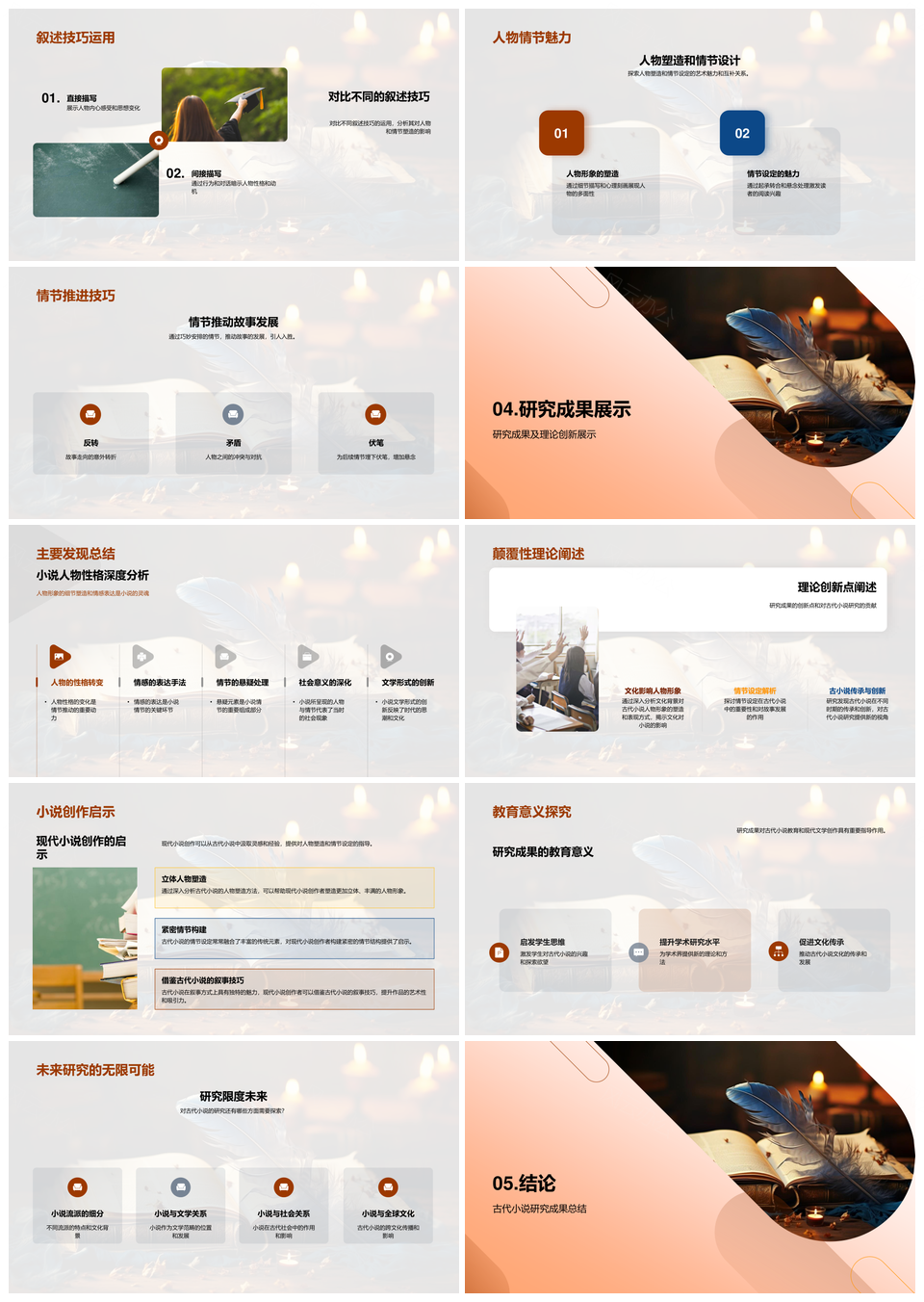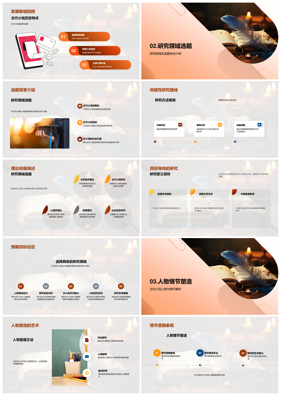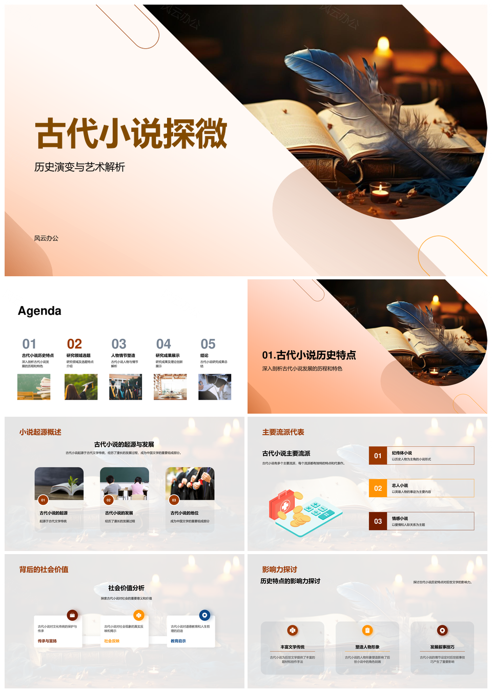 风云办公提供的古代小说演变艺术解析与人物情节研究PPT模板,下载格式为pptx,一共33页,作品中文字及图均可以修改和编辑,图片更改请在作品中右键图片并更换,文字修改请直接点击文字进行修改。