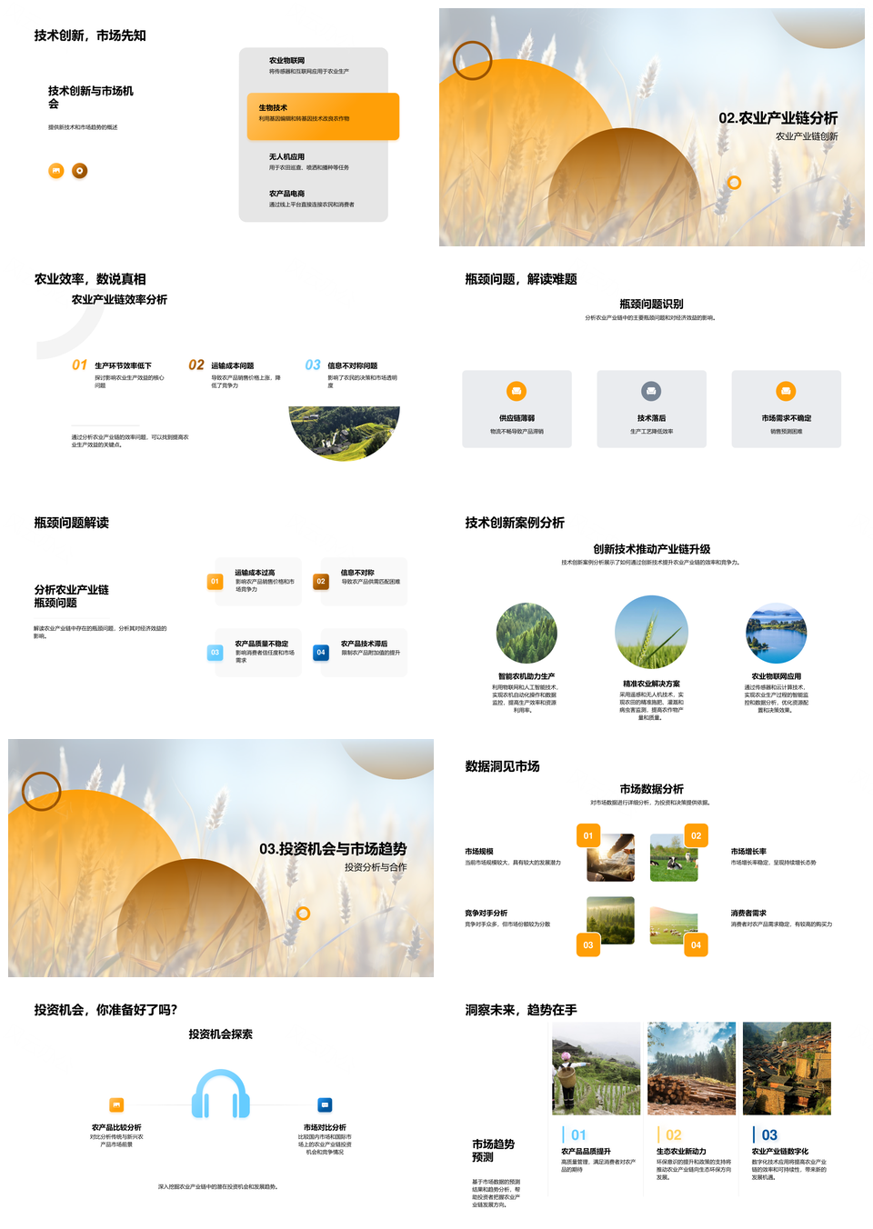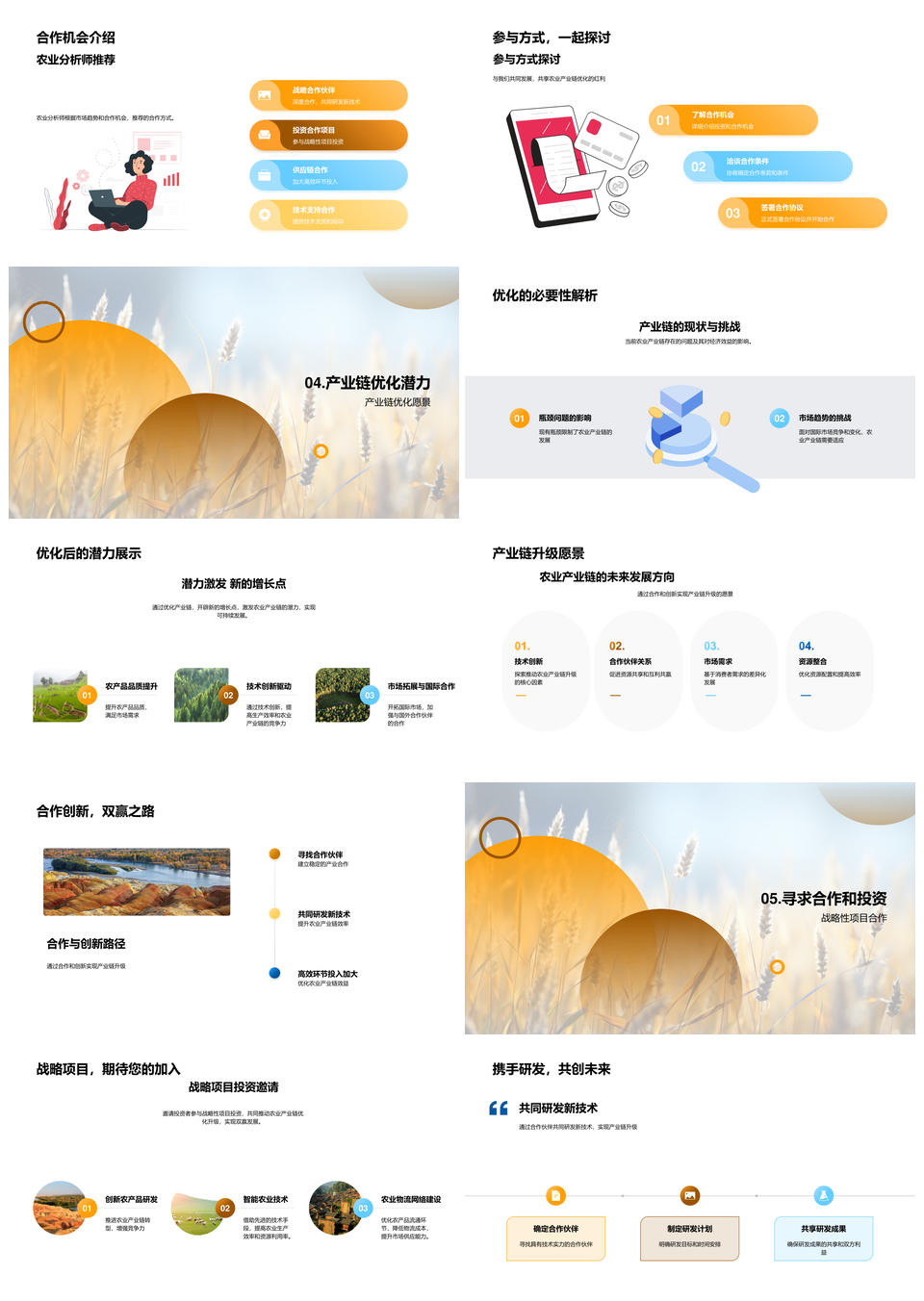 这是一张农业产业链升级投资创新技术国际竞争合作PPT模板,包含农业、产业链、升级、投资、创新技术、国际、竞争、合作等主题内容,也可用作农业产业链升级投资创新技术国际竞争、农业产业链升级投资创新技术、产业链升级投资创新技术国际、升级投资创新技术国际竞争、投资创新技术国际竞争合作、农业产业链升级投资创新、产业链升级投资创新技术、升级投资创新技术国际、创新技术国际竞争合作、农业产业链升级投资、产业链升级投资创新、升级投资创新技术、投资创新技术国际、国际竞争合作、创新技术国际竞争等PPT场景使用。 风云办公提供的农业产业链升级投资创新技术国际竞争合作PPT模板,下载格式为pptx,一共29页,作品中文字及图均可以修改和编辑,图片更改请在作品中右键图片并更换,文字修改请直接点击文字进行修改。