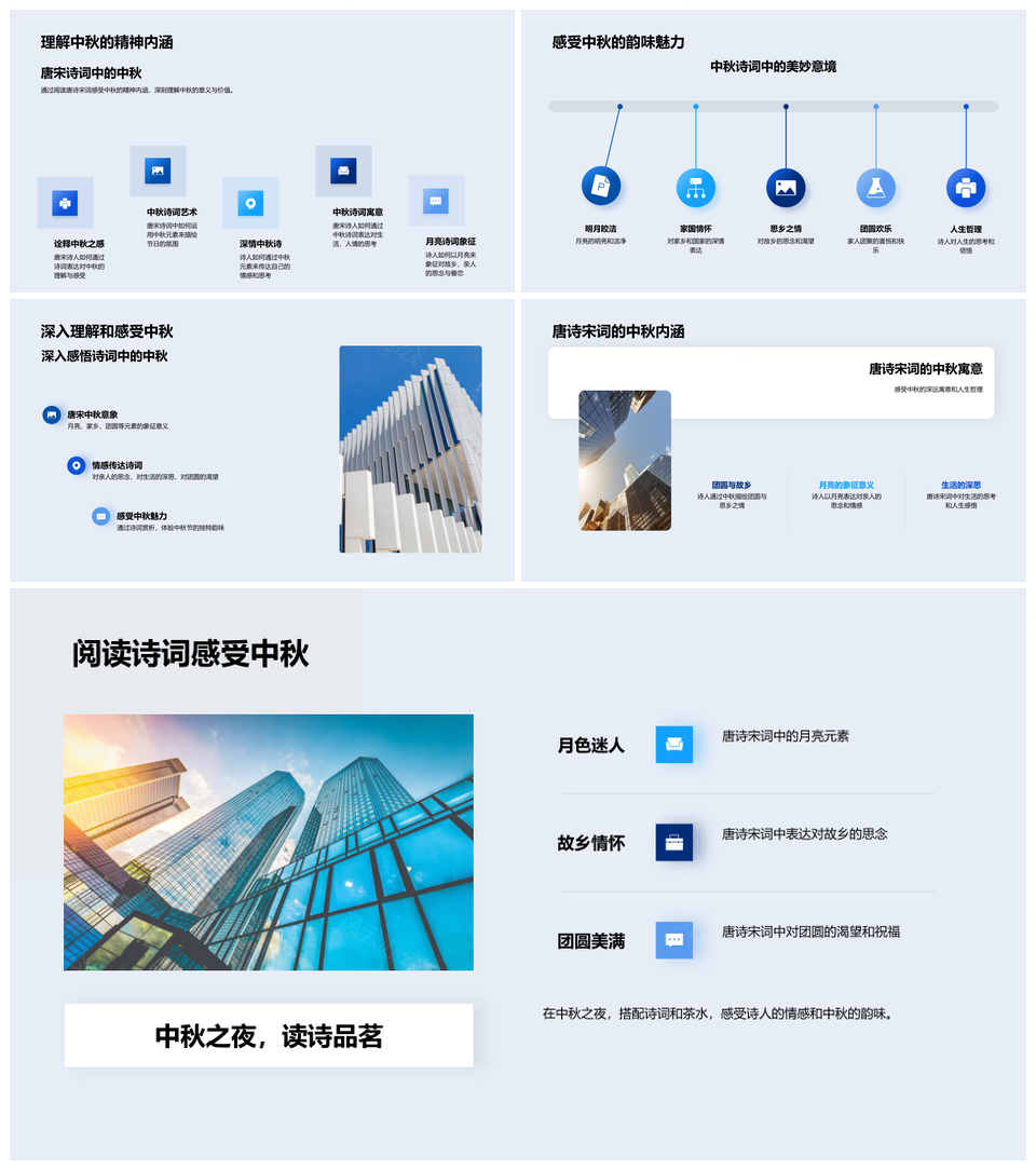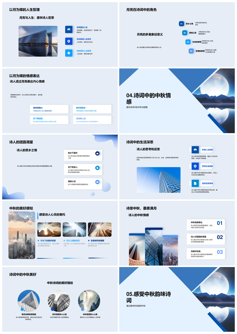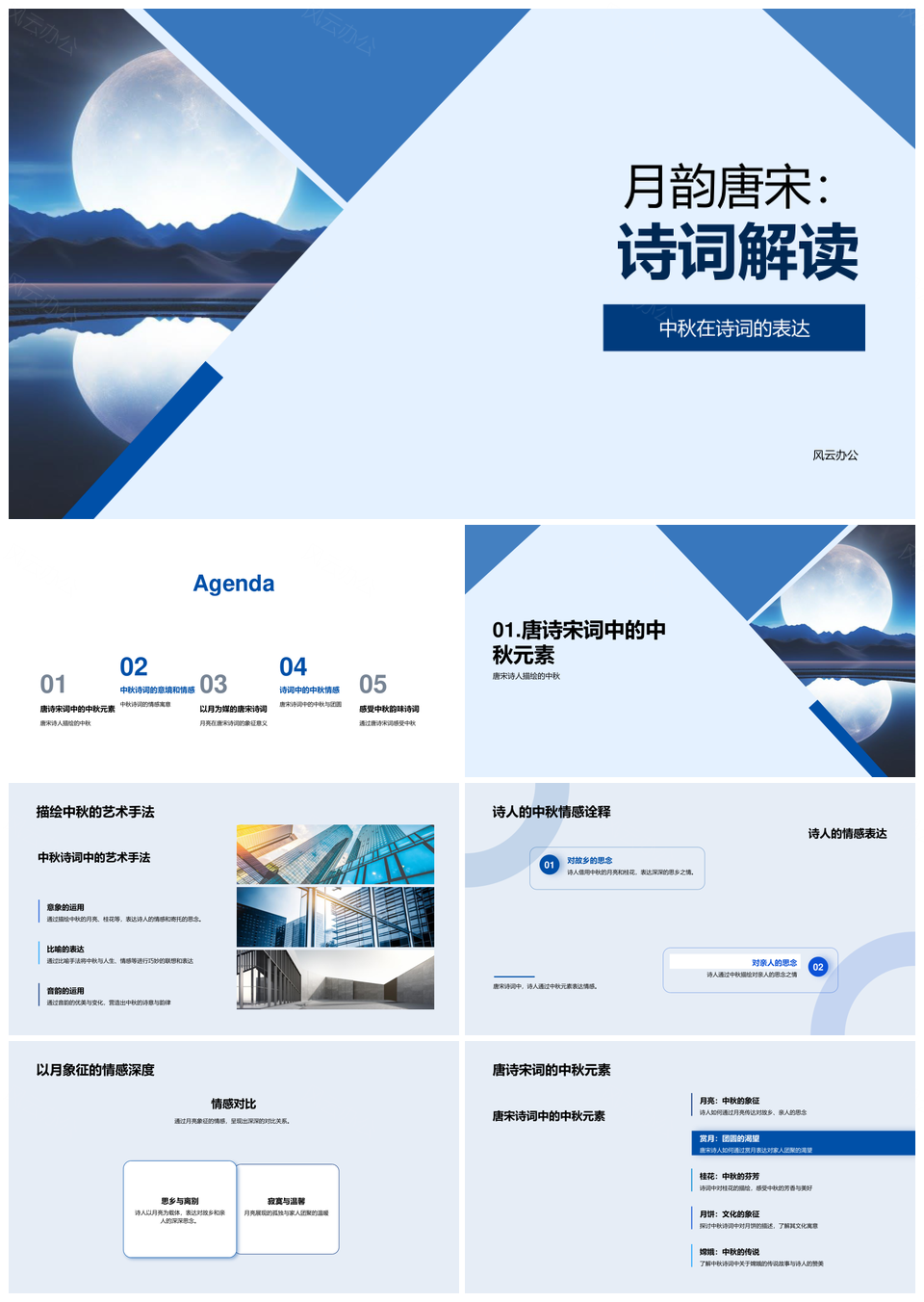 风云办公提供的唐宋诗词中秋月韵情感深度解读PPT模板,下载格式为pptx,一共33页,作品中文字及图均可以修改和编辑,图片更改请在作品中右键图片并更换,文字修改请直接点击文字进行修改。