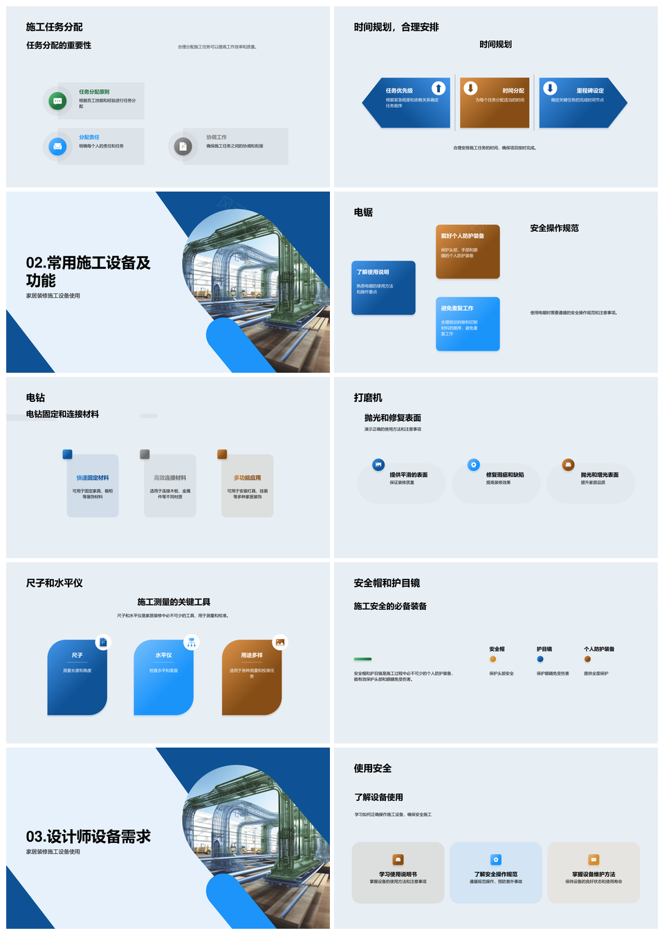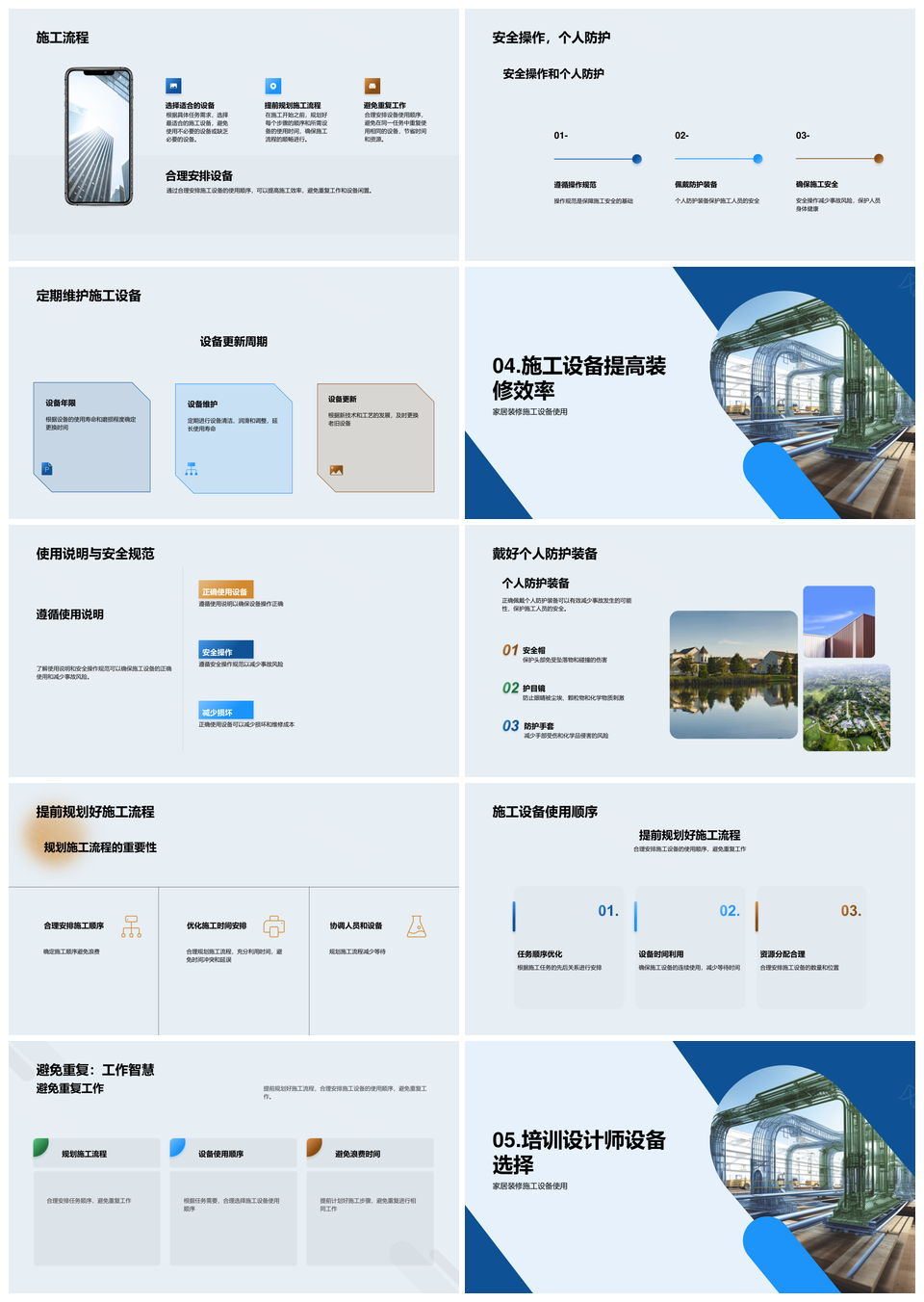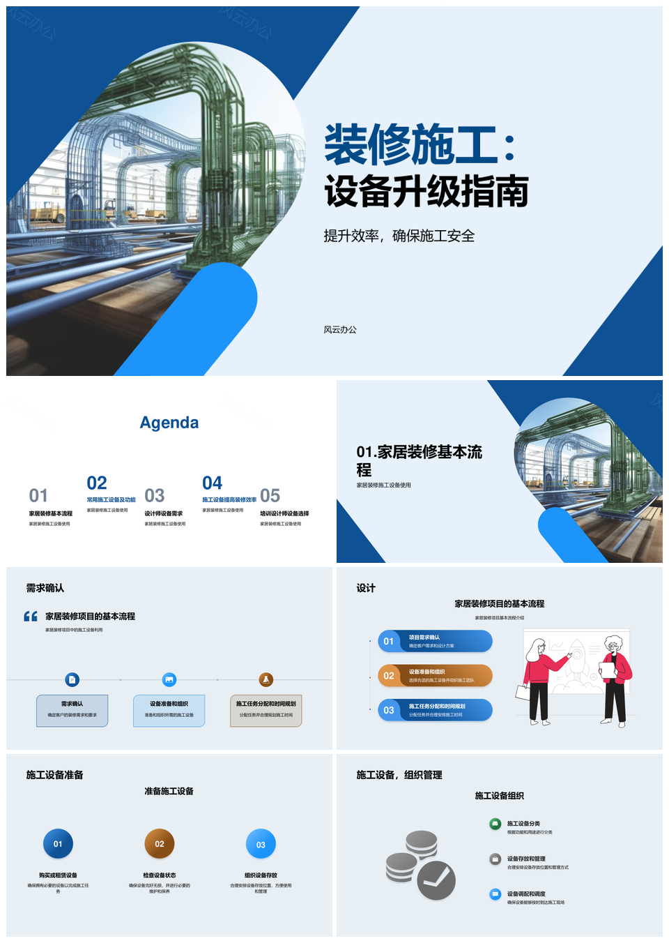 风云办公提供的家装施工设备升级提效保质指南PPT模板,下载格式为pptx,一共32页,作品中文字及图均可以修改和编辑,图片更改请在作品中右键图片并更换,文字修改请直接点击文字进行修改。
