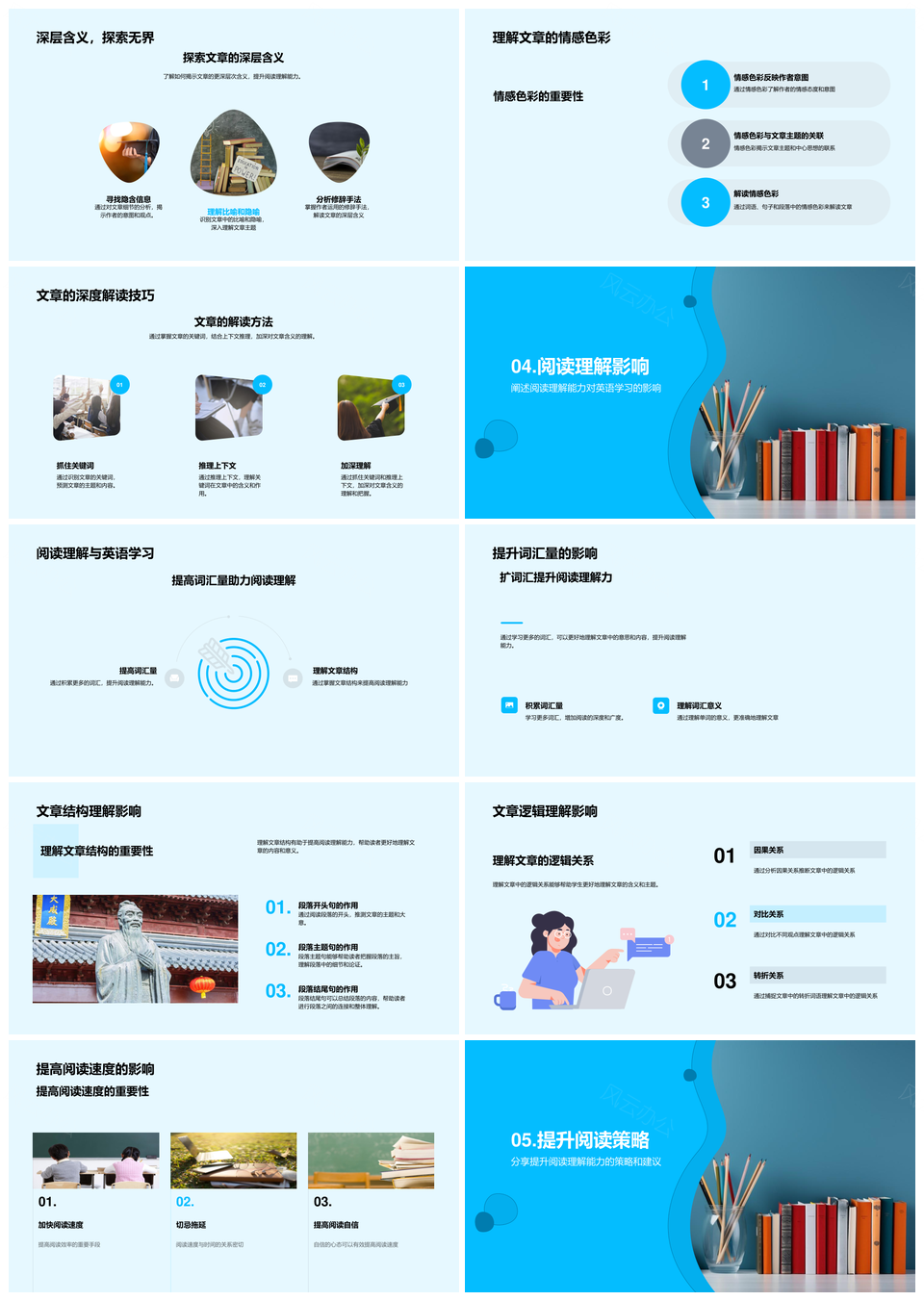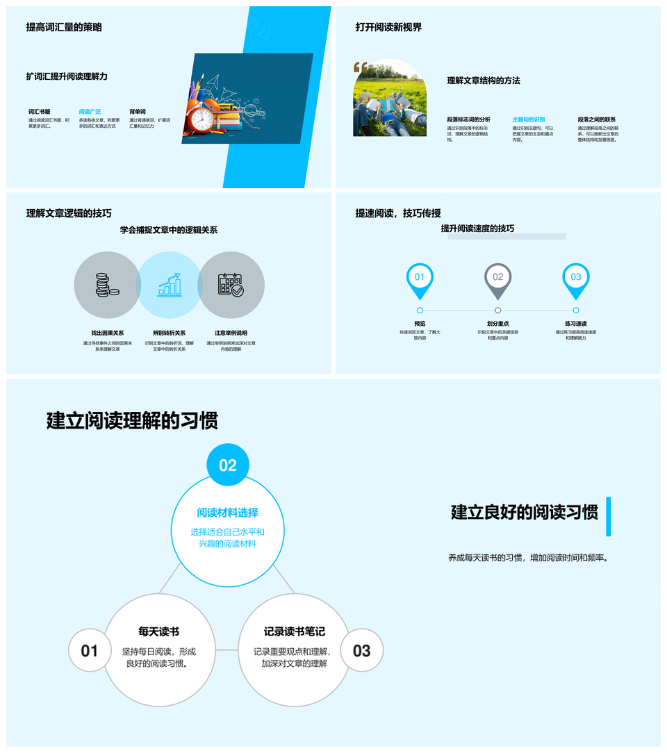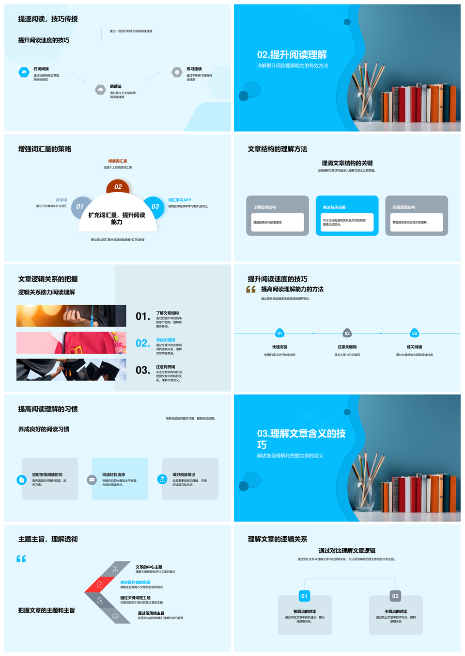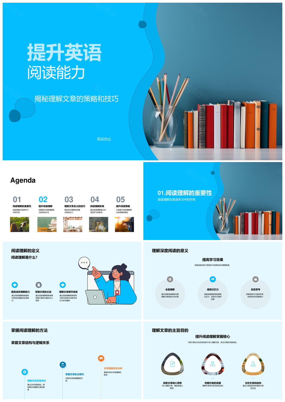 风云办公提供的提升英语阅读结构逻辑词汇速度主旨PPT模板,下载格式为pptx,一共33页,作品中文字及图均可以修改和编辑,图片更改请在作品中右键图片并更换,文字修改请直接点击文字进行修改。