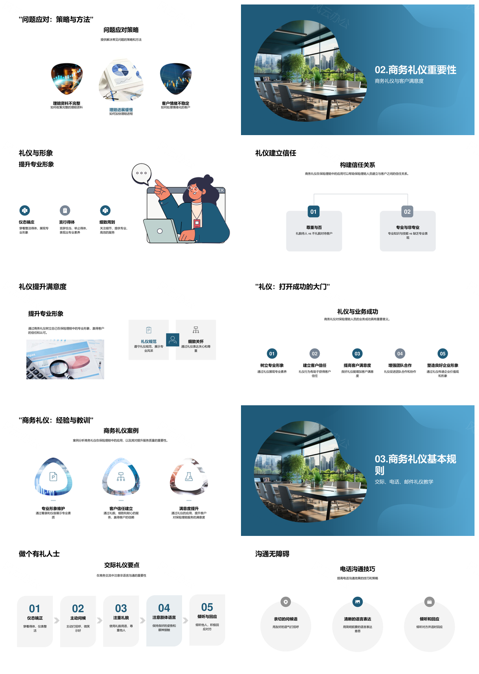 风云办公提供的保险理赔流程商务礼仪提升客户满意度PPT模板,下载格式为pptx,一共33页,作品中文字及图均可以修改和编辑,图片更改请在作品中右键图片并更换,文字修改请直接点击文字进行修改。