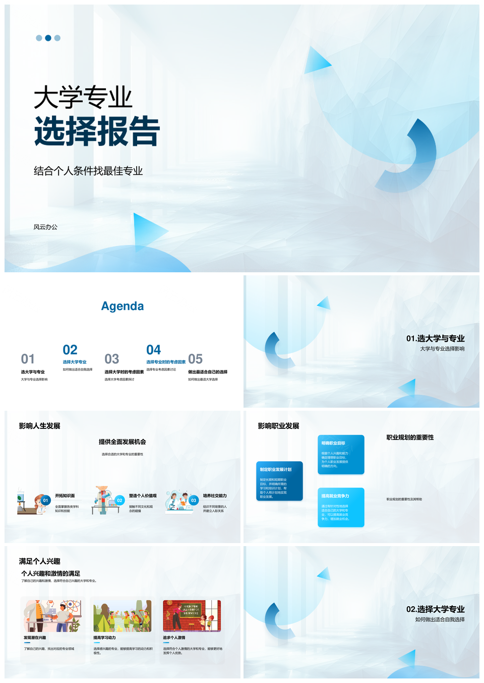 风云办公提供的大学专业选择与个人职业人生发展规划PPT模板,下载格式为pptx,一共23页,作品中文字及图均可以修改和编辑,图片更改请在作品中右键图片并更换,文字修改请直接点击文字进行修改。