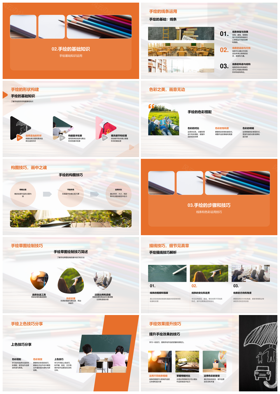 这是一张手绘艺术基础线条色彩构图创思PPT模板,包含手绘艺术、基础、线条、色彩、构图、创思等主题内容,也可用作手绘艺术基础线条、艺术基础线条色彩、基础线条色彩构图、线条色彩构图创思、手绘艺术基础、艺术基础线条、基础线条色彩、线条色彩构图、色彩构图创思、手绘艺术、艺术基础、基础线条、线条色彩、色彩构图、构图创思等PPT场景使用。