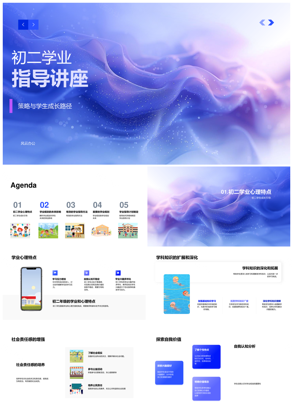 风云办公提供的初二学业规划与职业心理指导PPT模板,下载格式为pptx,一共31页,作品中文字及图均可以修改和编辑,图片更改请在作品中右键图片并更换,文字修改请直接点击文字进行修改。