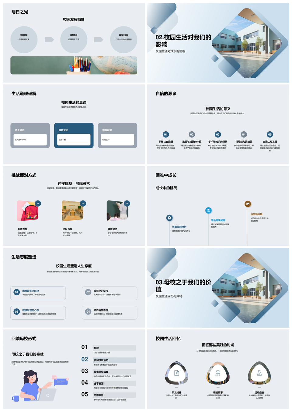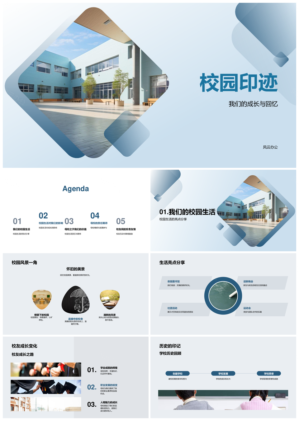风云办公提供的校友成长母校建筑岁月印记PPT模板,下载格式为pptx,一共33页,作品中文字及图均可以修改和编辑,图片更改请在作品中右键图片并更换,文字修改请直接点击文字进行修改。