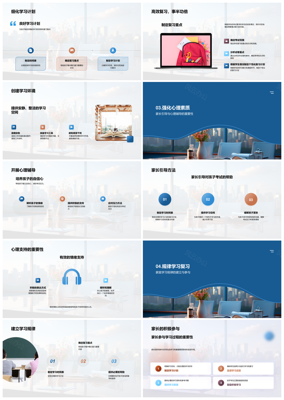 这是一张初一考试复习重点家长心理支持学习时间表PPT模板,包含初一、考试、复习、重点、家长、心理、支持、学习、时间表等主题内容,也可用作初一考试复习重点家长心理支持学习、初一考试复习重点、考试复习重点家长心理、复习重点家长心理支持、重点家长心理支持学习、家长心理支持学习时间表、考试复习重点家长、复习重点家长心理、重点家长心理支持、家长心理支持学习、初一考试复习、考试复习重点、复习重点家长、家长心理支持、心理支持学习时间表等PPT场景使用。 风云办公提供的初一考试复习重点家长心理支持学习时间表PPT模板,下载格式为pptx,一共23页,作品中文字及图均可以修改和编辑,图片更改请在作品中右键图片并更换,文字修改请直接点击文字进行修改。