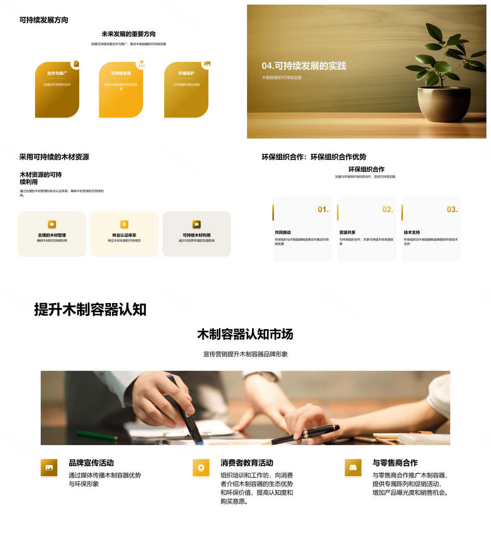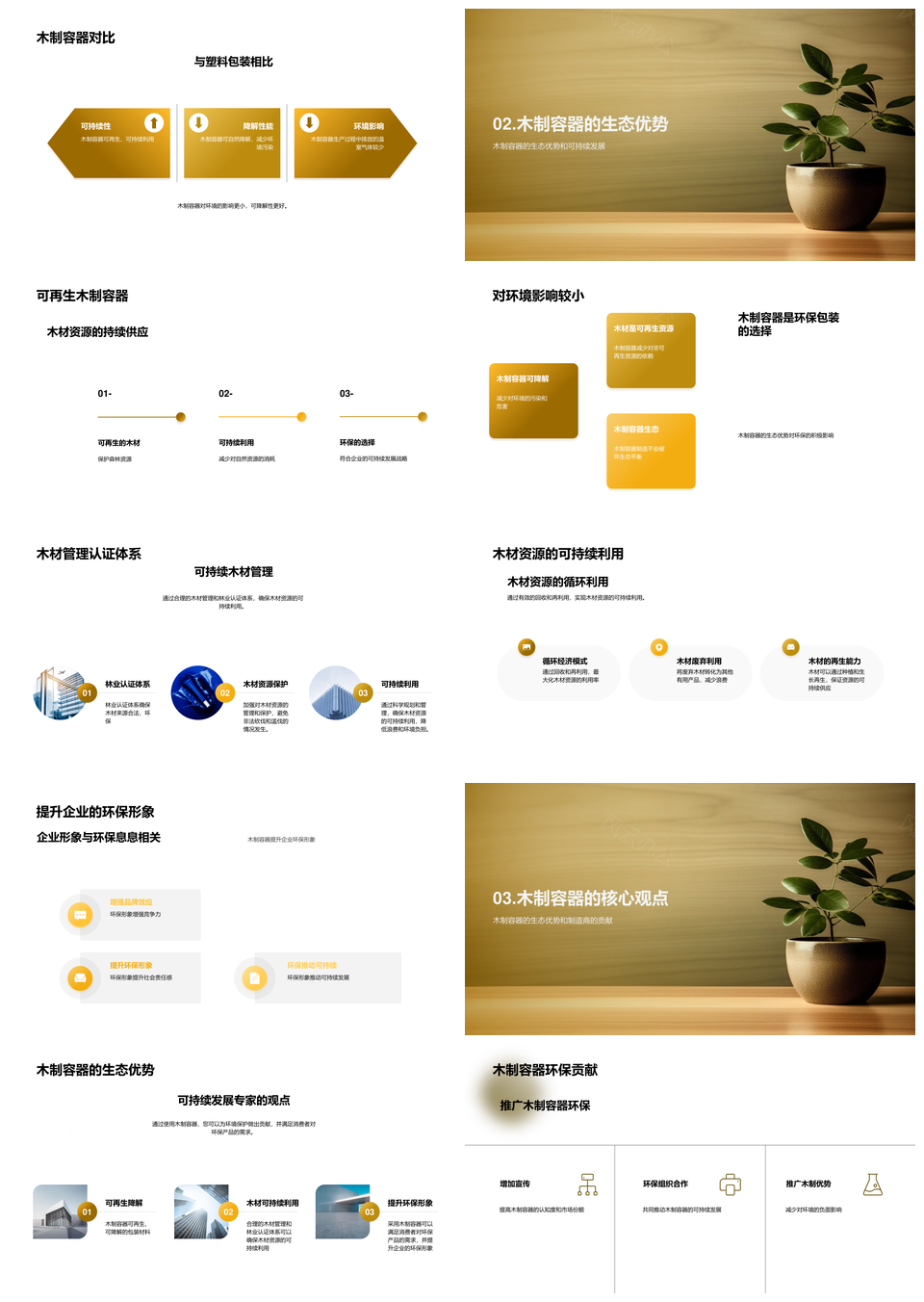 这是一张木制容器环保可持续生态包装可再生可降解PPT模板,包含木制容器、环保、可持续、生态包装、可再生、可降解等主题内容,也可用作木制容器环保可持续生态包装、环保可持续生态包装可再生、可持续生态包装可再生可降解、木制容器环保可持续生态、容器环保可持续生态包装、生态包装可再生可降解环保、木制环保可持续生态包装、环保可持续包装可再生降解、可持续生态包装可降解再生、木制容器环保可持续、容器环保可持续生态、生态包装可再生降解、环保可持续生态包装、可持续包装可降解、木制容器环保、环保可持续生态、可持续生态包装、生态包装可再生、包装可再生降解、可降解环保可持续等PPT场景使用。 风云办公提供的木制容器环保可持续生态包装可再生可降解PPT模板,下载格式为pptx,一共23页,作品中文字及图均可以修改和编辑,图片更改请在作品中右键图片并更换,文字修改请直接点击文字进行修改。