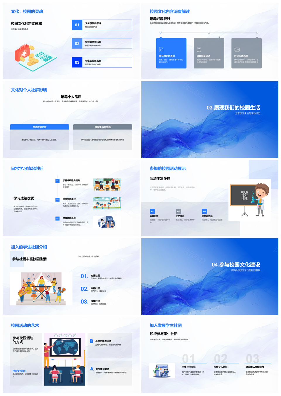 这是一张校园文化社团生活优美环境设施齐备共创共享PPT模板,包含校园文化、社团生活、优美环境、设施齐备、共创共享等主题内容,也可用作校园文化社团生活优美环境设施齐备、社团生活优美环境设施齐备共创共享、校园文化社团生活优美环境、校园文化社团生活设施齐备、校园文化社团生活共创共享、校园文化优美环境设施齐备、校园文化优美环境共创共享、校园文化设施齐备共创共享、社团生活优美环境设施齐备、社团生活优美环境共创共享、社团生活设施齐备共创共享、优美环境设施齐备共创共享、校园文化优美环境、校园文化设施齐备、优美环境设施齐备等PPT场景使用。 风云办公提供的校园文化社团生活优美环境设施齐备共创共享PPT模板,下载格式为pptx,一共23页,作品中文字及图均可以修改和编辑,图片更改请在作品中右键图片并更换,文字修改请直接点击文字进行修改。