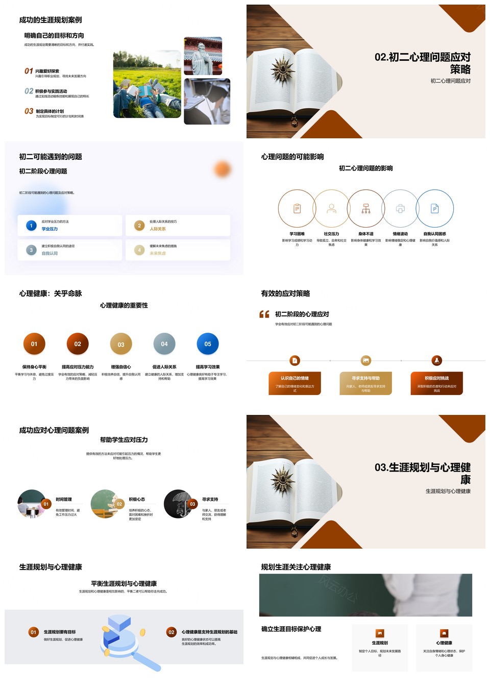 风云办公提供的初二生涯规划心理健康应对策略PPT模板,下载格式为pptx,一共29页,作品中文字及图均可以修改和编辑,图片更改请在作品中右键图片并更换,文字修改请直接点击文字进行修改。