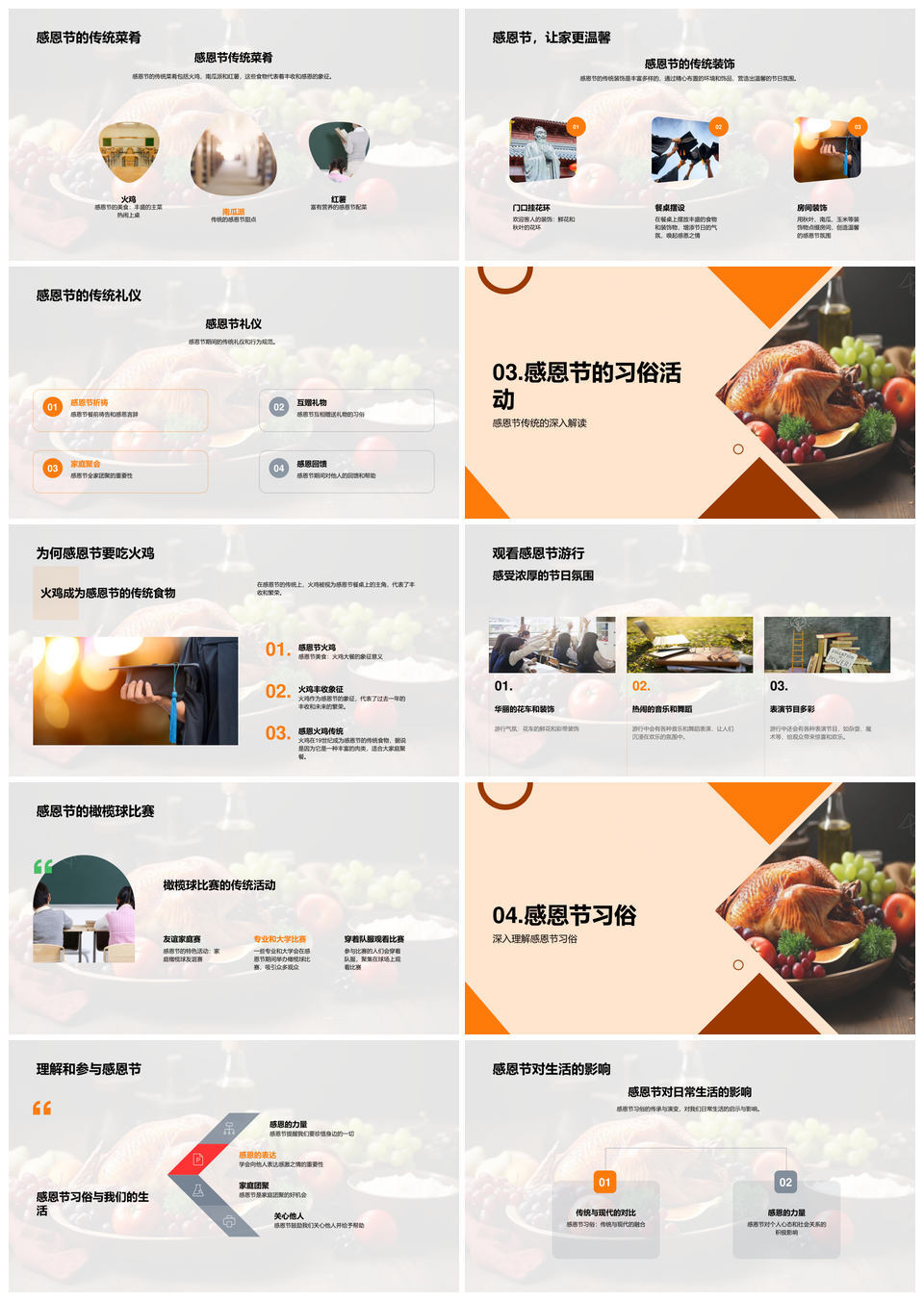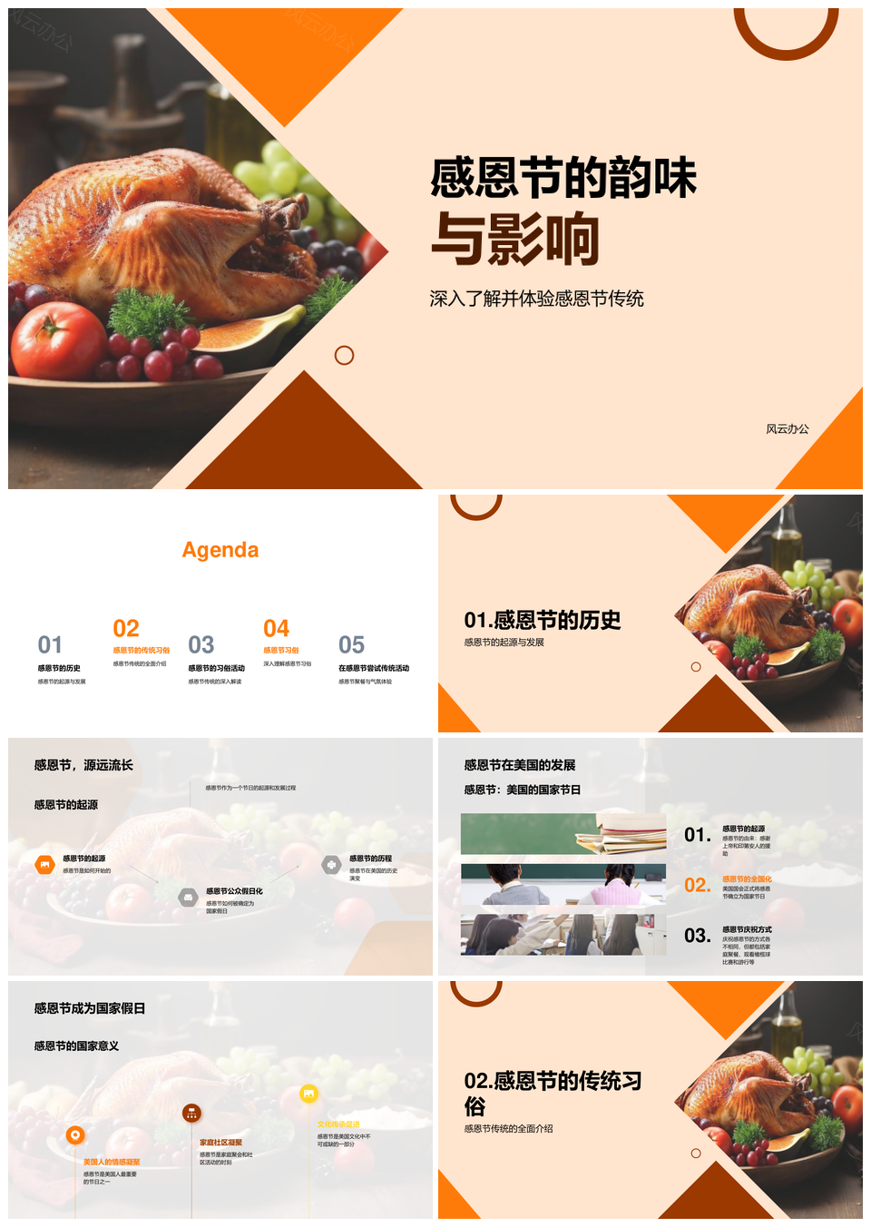 这是一张美国感恩节火鸡传统橄榄球习俗历史感恩PPT模板,包含感恩节、火鸡、传统、橄榄球、习俗、历史等主题内容,也可用作美国感恩节火鸡传统、感恩节火鸡传统橄榄球、火鸡传统橄榄球习俗、传统橄榄球习俗历史、橄榄球习俗历史感恩、美国感恩节火鸡、感恩节火鸡传统、火鸡传统橄榄球、传统橄榄球习俗、橄榄球习俗历史、习俗历史感恩、美国感恩节、感恩节火鸡、火鸡传统、传统橄榄球等PPT场景使用。 风云办公提供的美国感恩节火鸡传统橄榄球习俗历史感恩PPT模板,下载格式为pptx,一共23页,作品中文字及图均可以修改和编辑,图片更改请在作品中右键图片并更换,文字修改请直接点击文字进行修改。