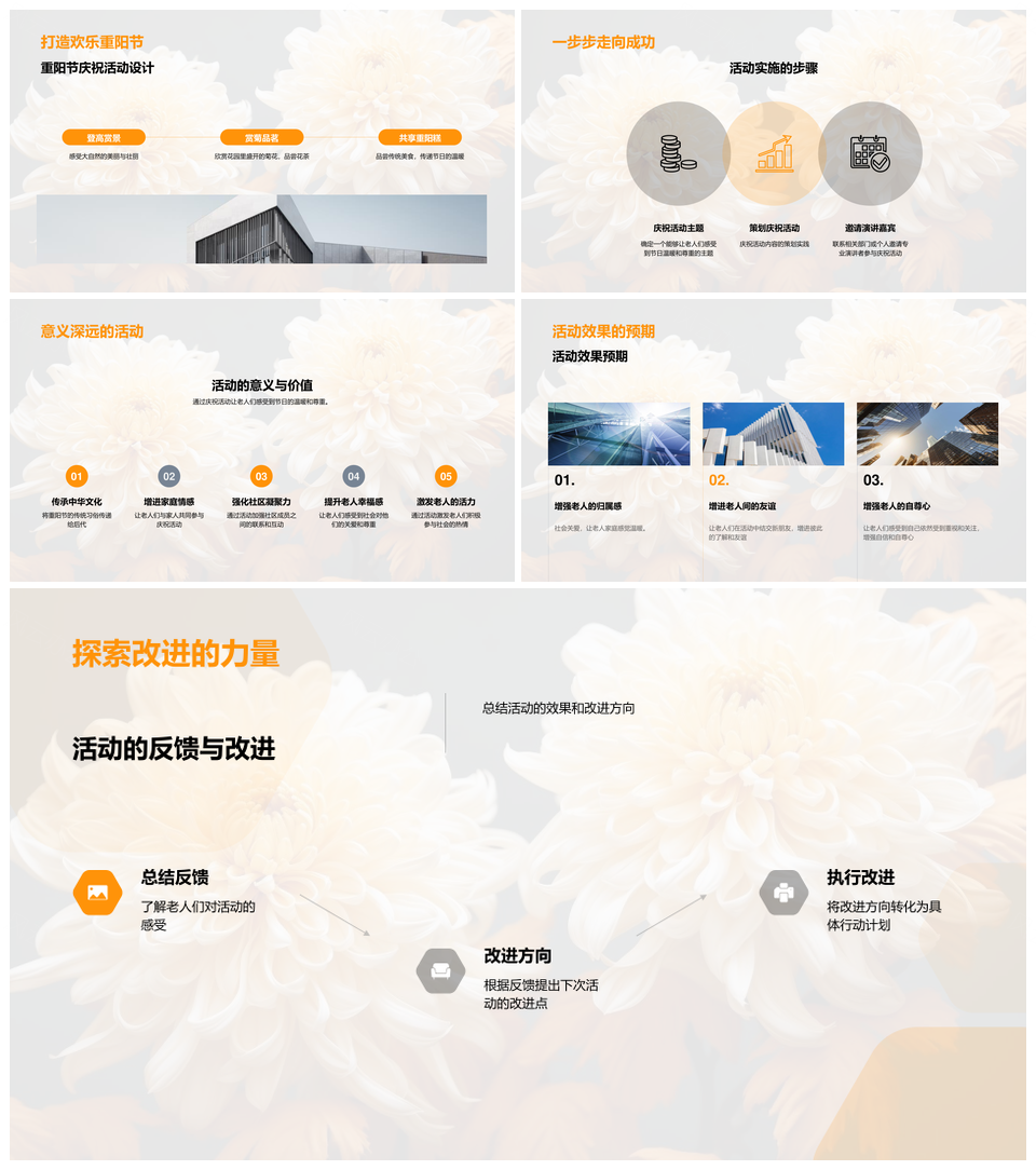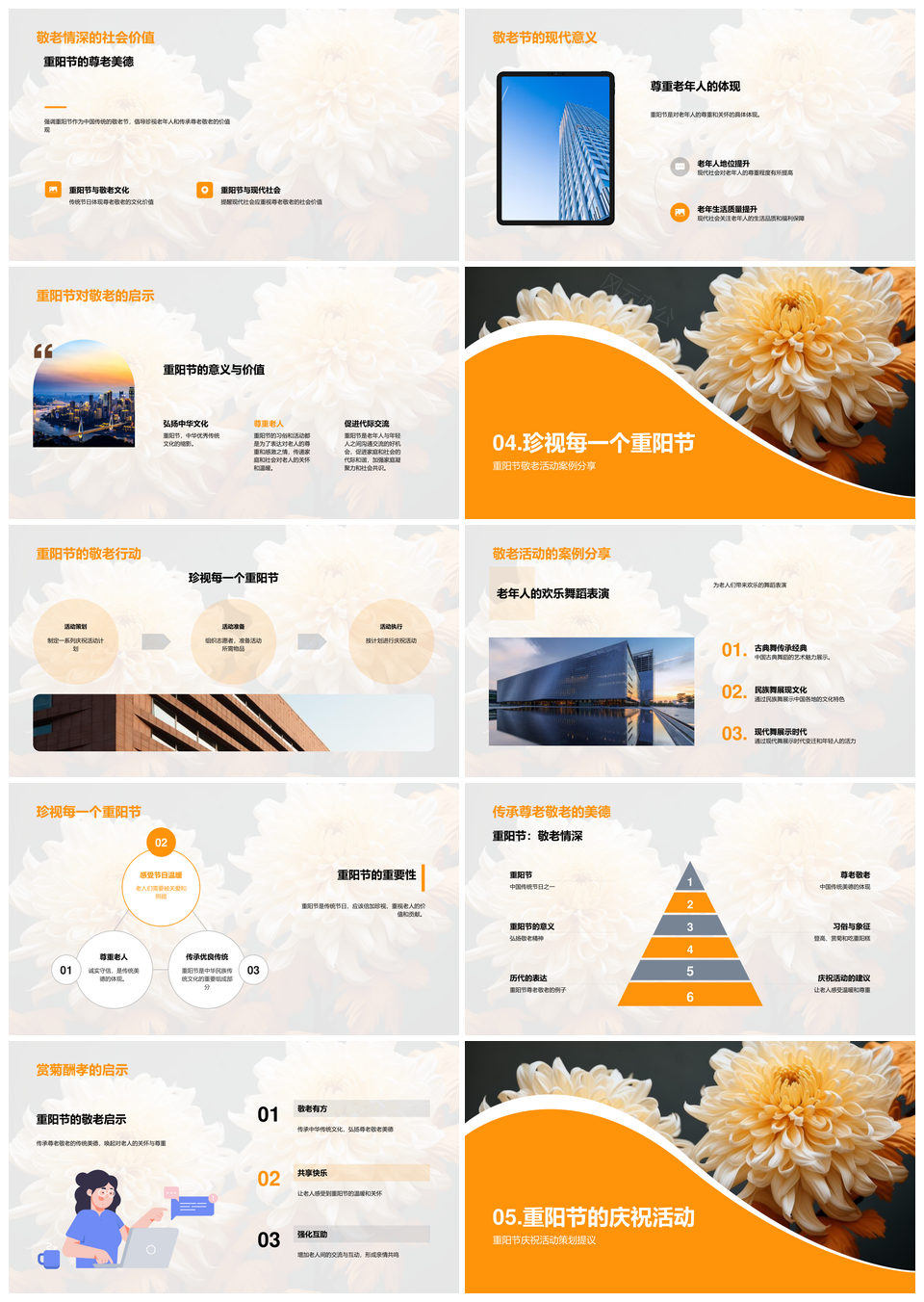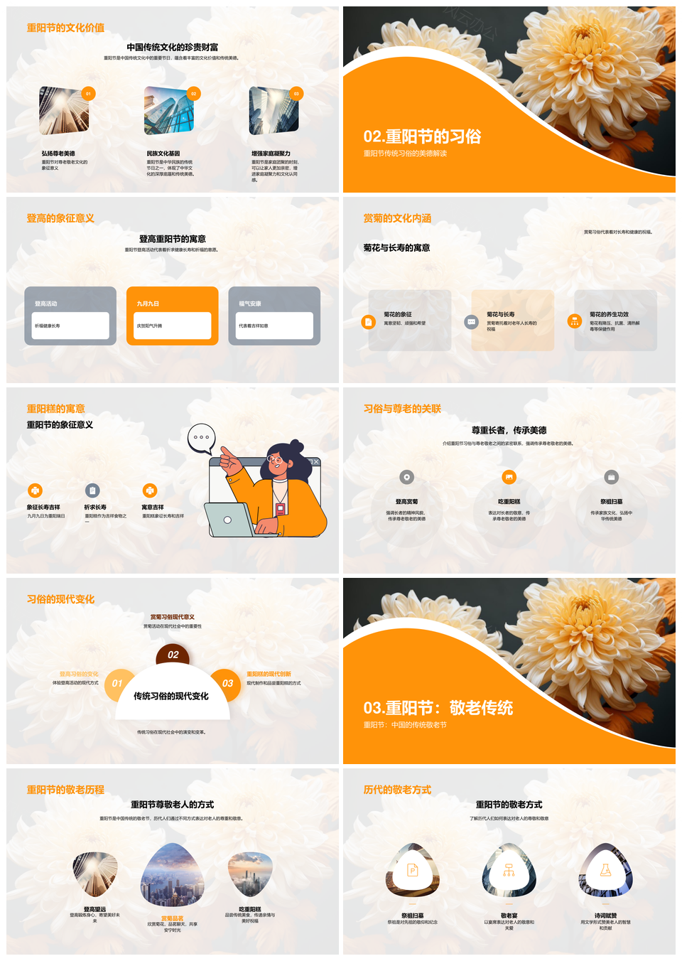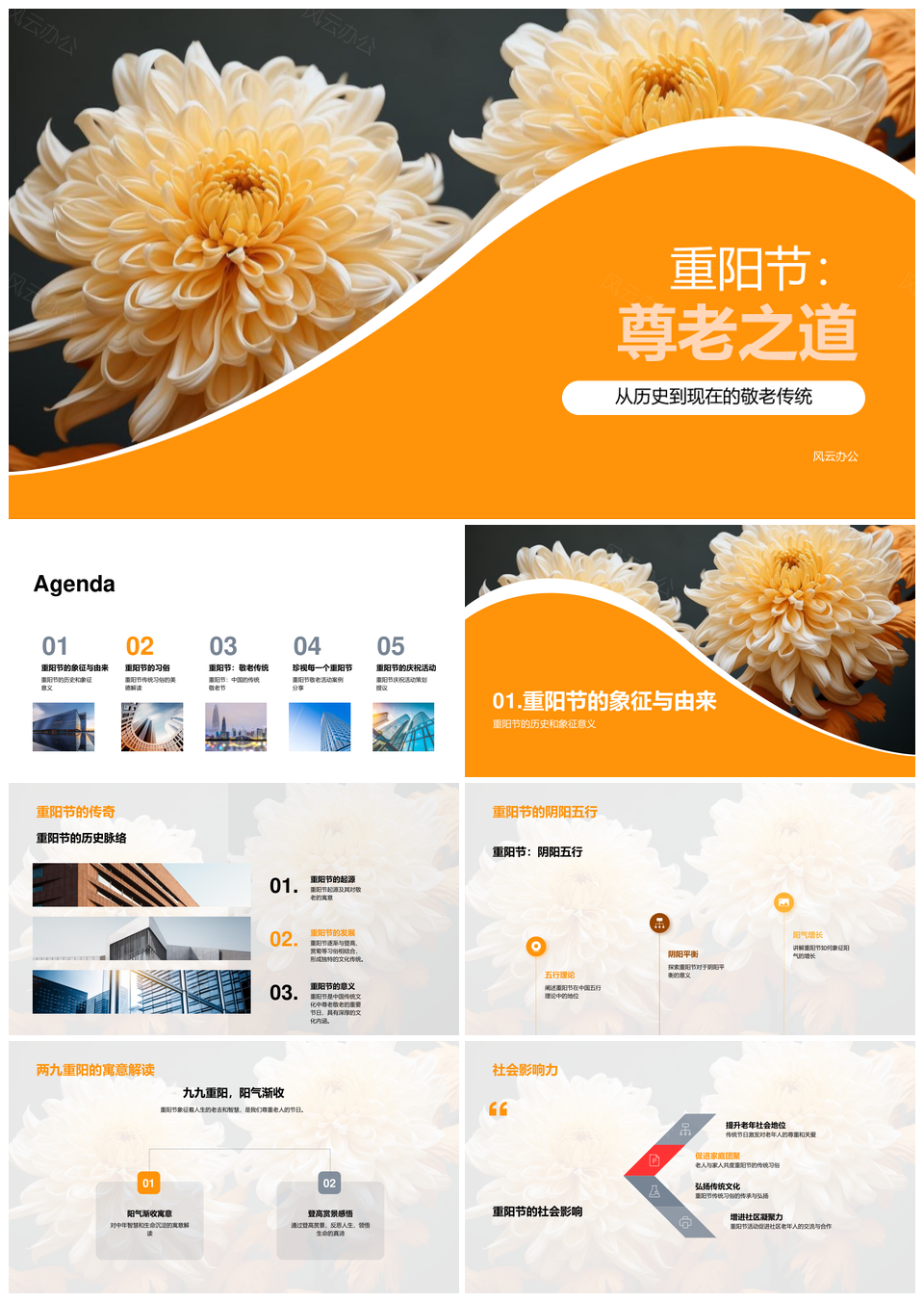 风云办公提供的重阳敬老传统登高赏菊承美德PPT模板,下载格式为pptx,一共33页,作品中文字及图均可以修改和编辑,图片更改请在作品中右键图片并更换,文字修改请直接点击文字进行修改。