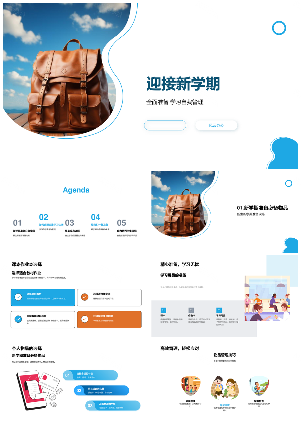 风云办公提供的开学自主计划学具时间管理备学品PPT模板,下载格式为pptx,一共26页,作品中文字及图均可以修改和编辑,图片更改请在作品中右键图片并更换,文字修改请直接点击文字进行修改。