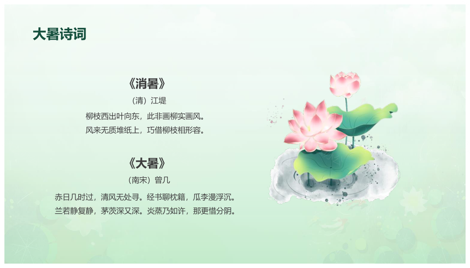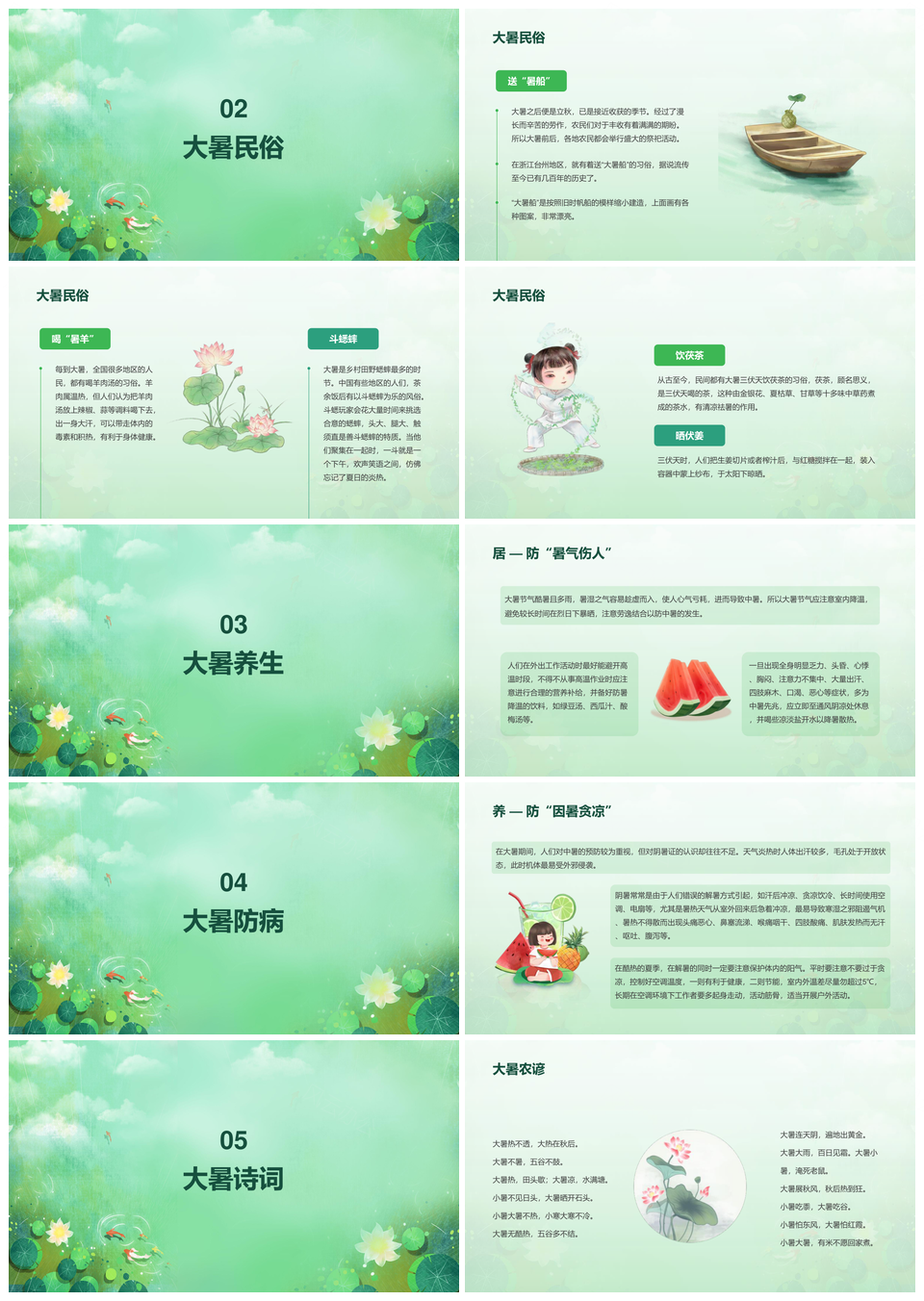 这是一张绿色插画大暑节气介绍培训课件PPT模板,包含绿色、插画、大暑、节气、介绍、培训、课件等主题内容,也可用作绿色插画大暑节气、插画大暑节气介绍、大暑节气介绍培训、节气介绍培训课件、绿色插画大暑、插画大暑节气、大暑节气介绍、节气介绍培训、介绍培训课件、绿色插画、插画大暑、大暑节气、节气介绍、介绍培训、培训课件等PPT场景使用。