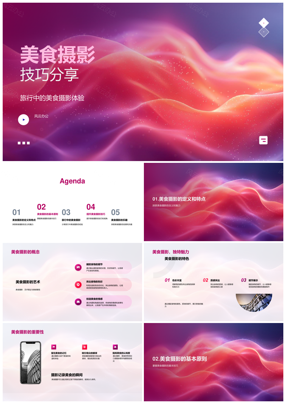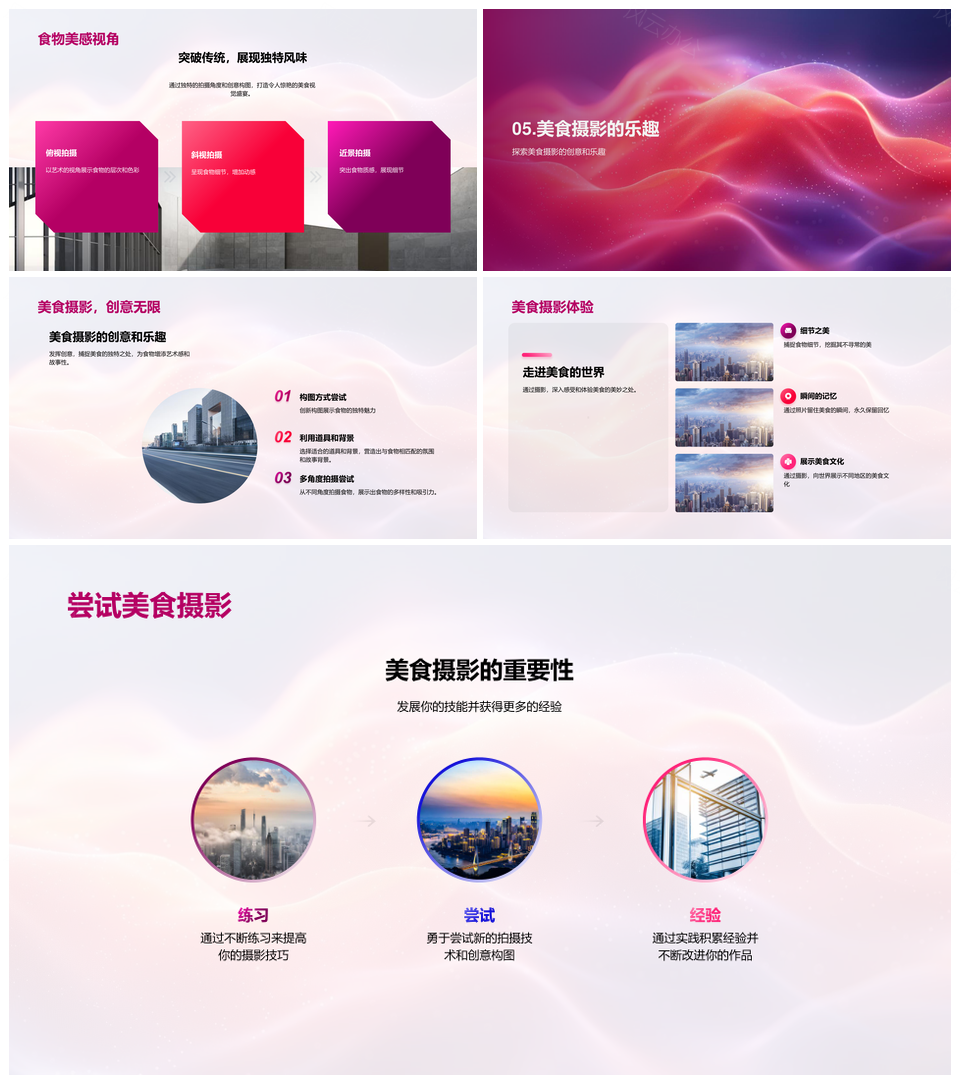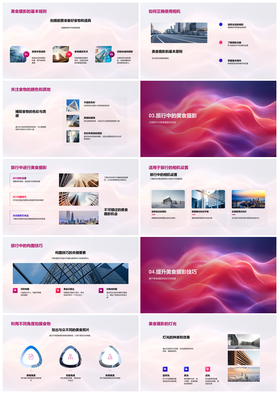 旅行美食摄影技巧相机设置构图灯光色彩创意PPT模板推荐