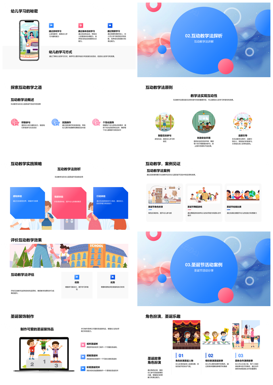 这款模板以白色为基底,融入正红与天蓝的节日配色,点缀浅蓝萌系插画,巧妙平衡专业感与治愈氛围。模块化布局支持自由调整结构,内置矢量图标与高清插图素材库,涵盖数据图表、流程图等商务场景。严格遵循视觉设计规范,内容层级清晰同时保持灵动气质,既满足教学课件、年终汇报的严谨需求,也适配儿童节活动等趣味场景。所有元素均可无损拆分编辑,覆盖浅色与深色模式,确保跨设备演示的视觉一致性,助你高效完成个性化创作。