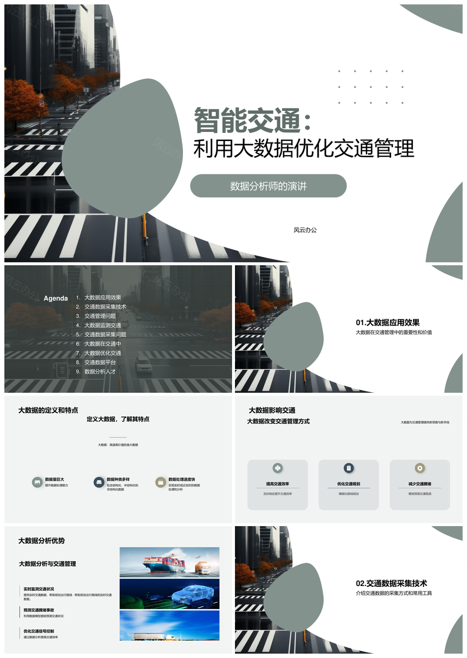 风云办公提供的智能交通大数据分析优化交通管理PPT模板,下载格式为pptx,一共40页,作品中文字及图均可以修改和编辑,图片更改请在作品中右键图片并更换,文字修改请直接点击文字进行修改。