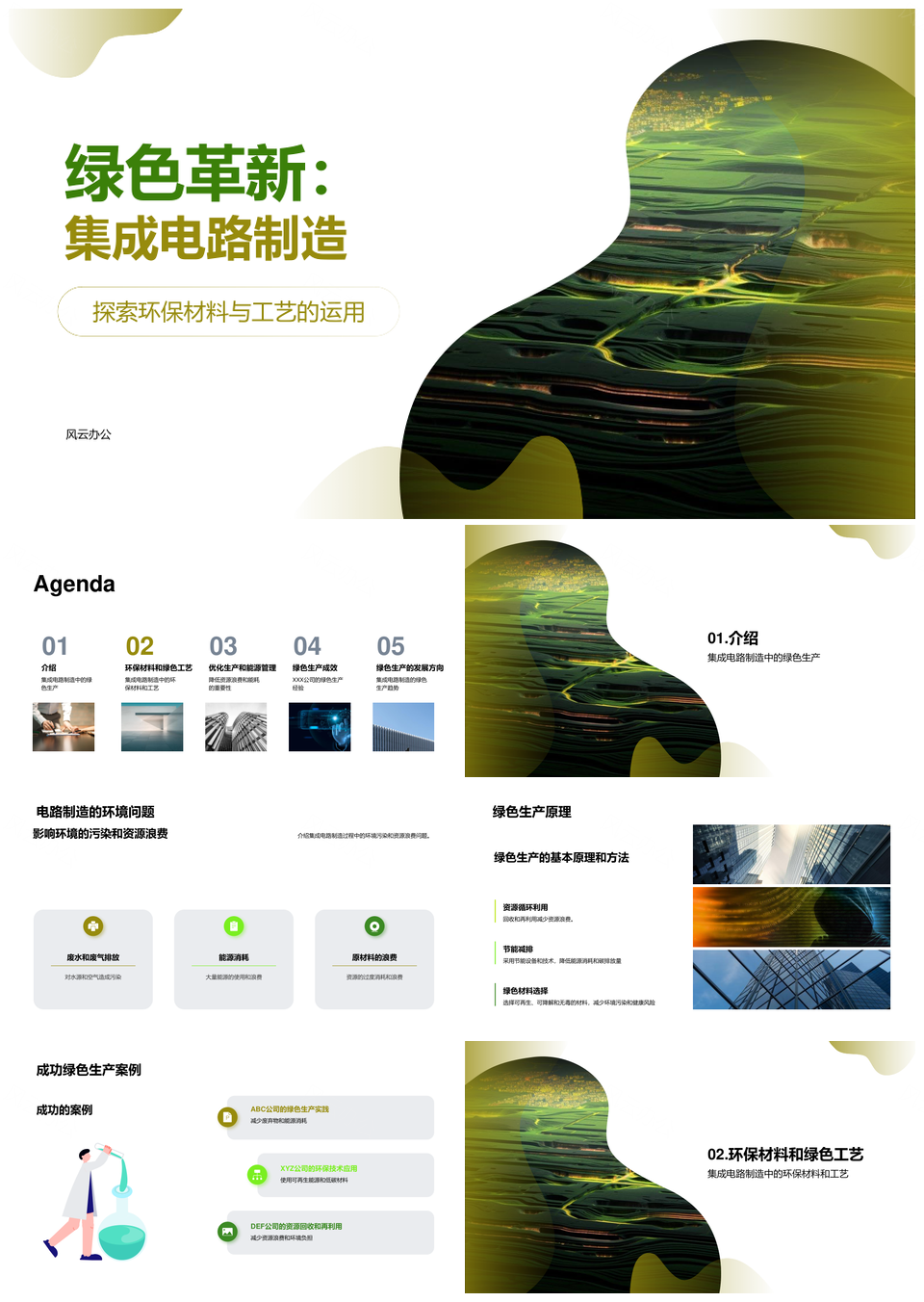 风云办公提供的集成电路绿色制造环保技术实践分享PPT模板,下载格式为pptx,一共20页,作品中文字及图均可以修改和编辑,图片更改请在作品中右键图片并更换,文字修改请直接点击文字进行修改。