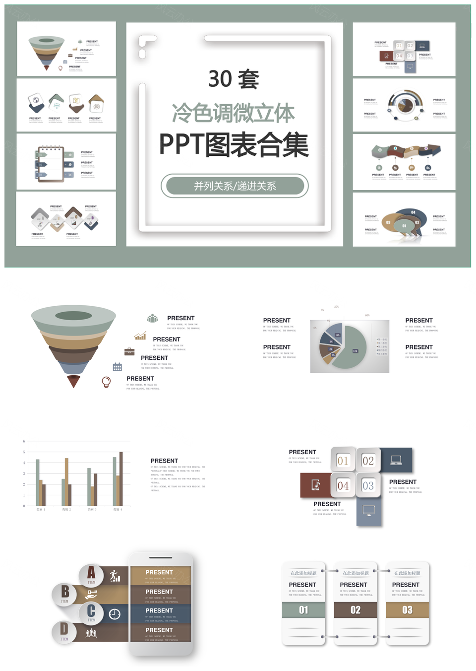 这是一张冷色调微立体并列关系递进关系PPT图表合集,包含冷色调、微立体、并列关系、递进关系、图表合集等主题内容,也可用作冷色调、微立体、并列关系、递进关系、PPT图表、合集