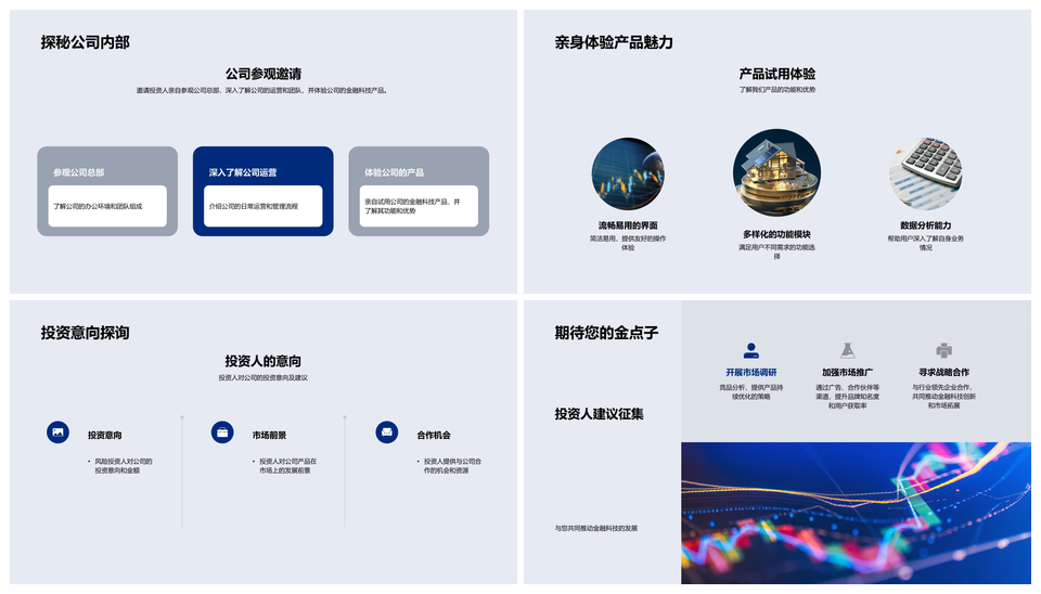这是一张金融科技投资策略商业模式创新融资盈利报告PPT模板,包含金融科技、投资策略、商业模式、创新、融资、盈利、报告等主题内容,也可用作金融科技投资策略商业模式创新、投资策略商业模式创新融资、商业模式创新融资盈利报告、金融科技投资策略创新融资、金融科技商业模式创新融资、投资策略创新融资盈利报告、金融科技投资策略商业模式、金融科技商业模式创新、投资策略商业模式创新、商业模式创新融资、创新融资盈利报告、金融科技投资策略创新、金融科技商业模式融资、金融科技创新、融资盈利报告等PPT场景使用。 风云办公提供的金融科技投资策略商业模式创新融资盈利报告PPT模板,下载格式为pptx,一共32页,作品中文字及图均可以修改和编辑,图片更改请在作品中右键图片并更换,文字修改请直接点击文字进行修改。