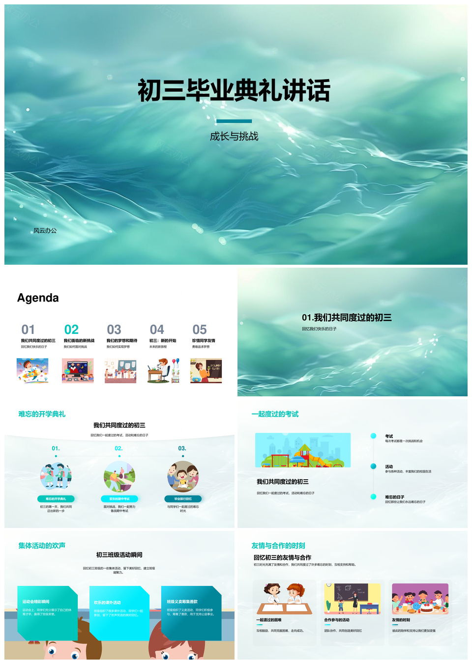 风云办公提供的初三毕业典礼成长挑战环保教育讲话PPT模板,下载格式为pptx,一共33页,作品中文字及图均可以修改和编辑,图片更改请在作品中右键图片并更换,文字修改请直接点击文字进行修改。
