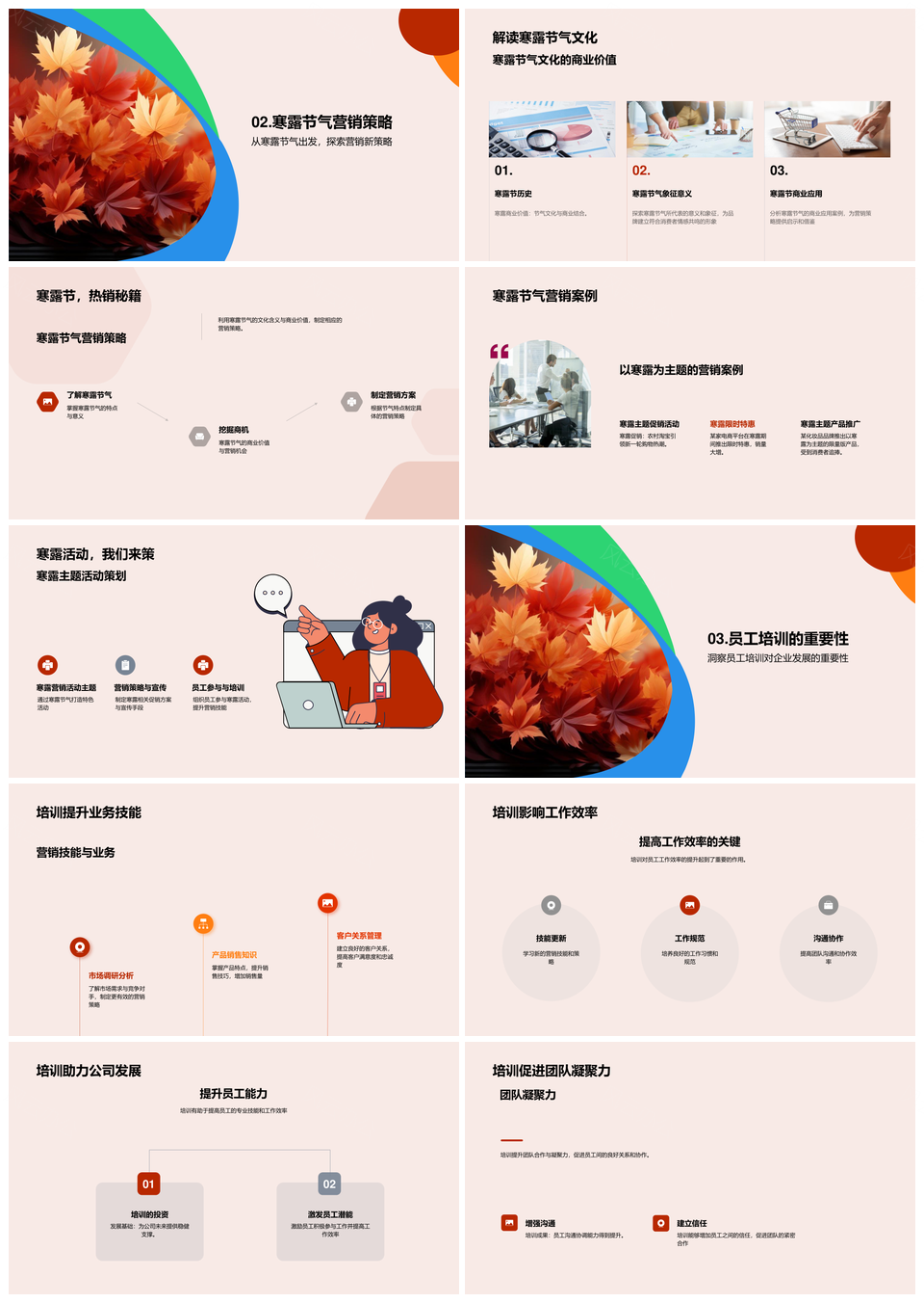 这是一张寒露秋叶营销培训案例分享PPT模板,包含寒露、秋叶、营销、培训、案例、分享等主题内容,也可用作寒露秋叶营销培训、秋叶营销培训案例、营销培训案例分享、寒露秋叶培训案例、寒露秋叶案例分享、寒露秋叶营销、秋叶营销培训、营销培训案例、培训案例分享、寒露营销培训、秋叶培训案例、秋叶案例分享、寒露秋叶、营销培训、案例分享等PPT场景使用。