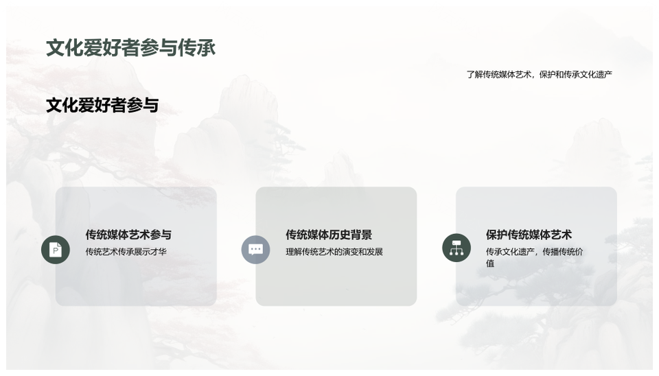 这是一张传统中国画文化传承与艺术教育课堂PPT模板,包含传统、中国画、文化、传承、艺术、教育、课堂等主题内容,也可用作传统中国画文化传承艺术教育、中国画文化传承艺术教育课堂、传统中国画艺术教育课堂、传统中国画文化传承、中国画文化传承艺术教育、文化传承艺术教育课堂、传统中国画艺术教育、中国画艺术教育课堂、传统文化传承艺术教育、传统中国画、中国画文化传承、文化传承艺术教育、艺术教育课堂、传统艺术教育、中国画艺术教育等PPT场景使用。