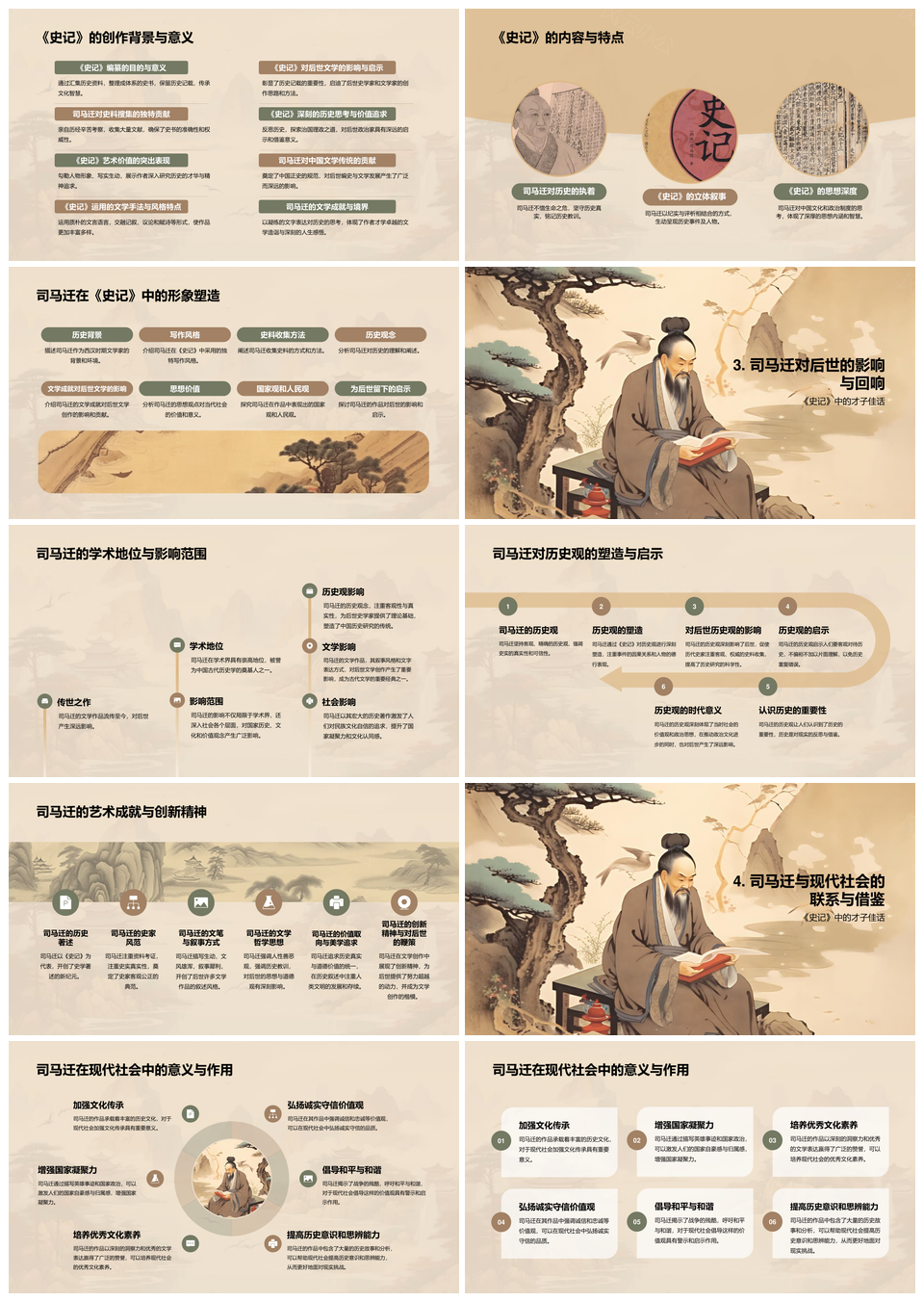 风云办公提供的黄色复古中国风工笔水墨司马迁历史人物课件,下载格式为pptx,一共20页,作品中文字及图均可以修改和编辑,图片更改请在作品中右键图片并更换,文字修改请直接点击文字进行修改。