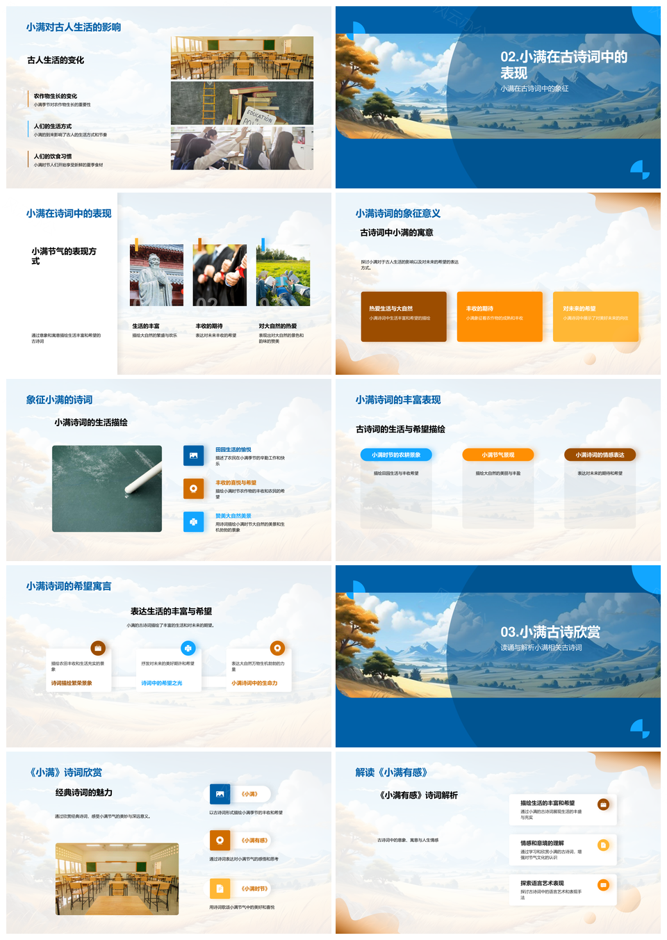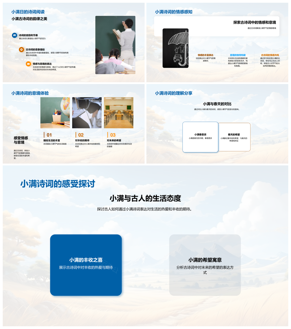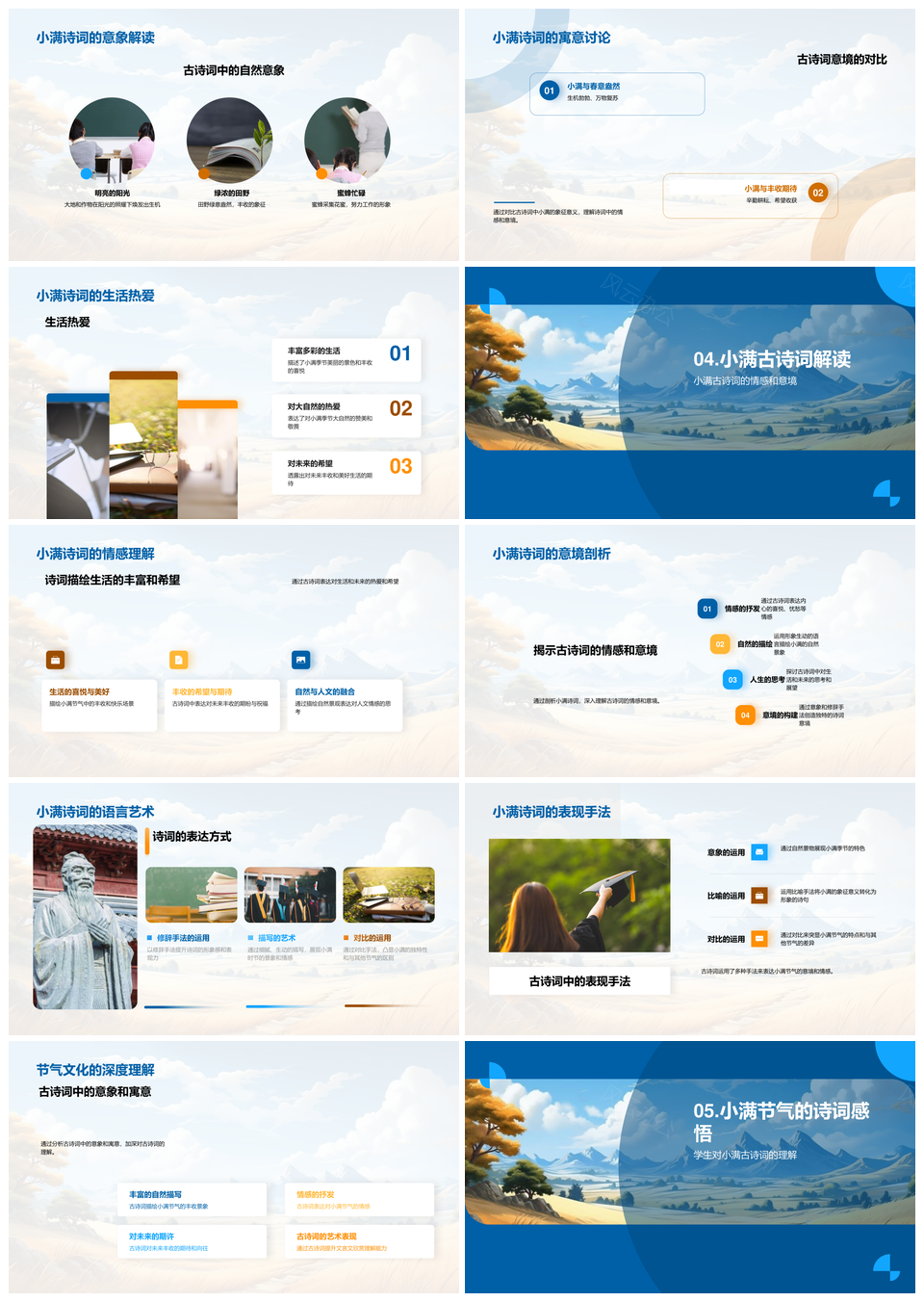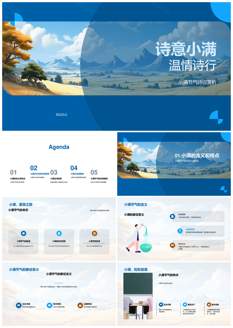 风云办公提供的小满古诗意境语言艺术教育卷轴PPT模板,下载格式为pptx,一共33页,作品中文字及图均可以修改和编辑,图片更改请在作品中右键图片并更换,文字修改请直接点击文字进行修改。